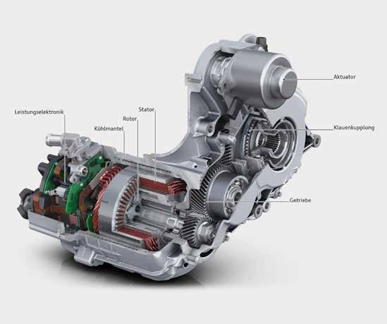 Audis Triebstranggenerator integriert eine E-Maschine, die Leistungselektronik sowie ein Getriebe mit einer Übersetzung von 3.6:1 in einem Gehäuse.