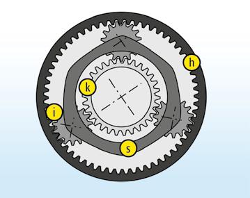 Bild 3. Einfache Planetengetriebe weisen in der Regel drei Planetenräder auf. k Sonnenrad – i Planetenrad – s Planetenträger – h Hohlrad.