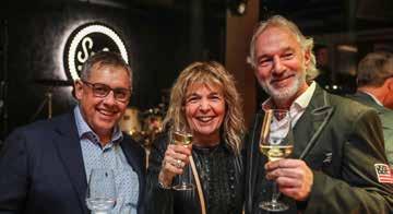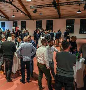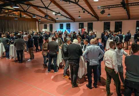 Jasmin Eichner und Giuseppe Cucchiara begrüssen die Gäste und bedanken sich bei den Sponsoren (Bild links). Vor dem Hauptprogramm lassen sich die Gäste im vorderen Eventsaal den Apéro schmecken.