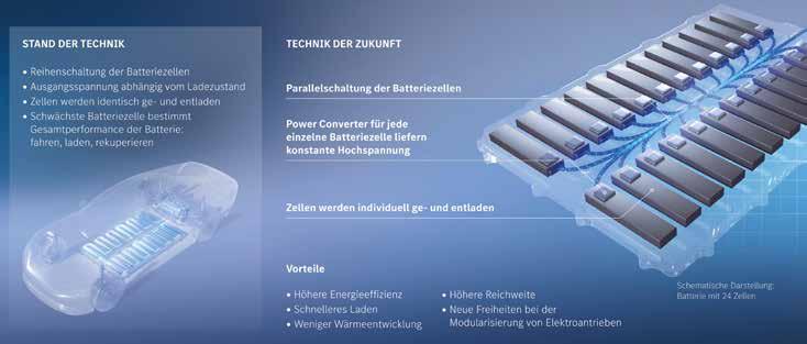 aus mehreren Mikrowandlern bestehender Power Converter wird direkt an eine beliebige Anzahl von Batteriezellen angeschlossen und ermöglicht es, Zellen individuell zu regeln und die Höhe der Ausgangsspannung dieser Einheit zu regeln. Die derzeitigen Forschungsergebnisse zeigen, dass damit – unabhängig vom Ladezustand und dem Alterungszustand der einzelnen Zellen – eine konstante Spannung von 800 V am Ausgang bereitgestellt werden kann. Dabei ist die Ausgangsspannung dieser gesamten Fahrzeugbatterie nicht mehr von der Anzahl der in Reihe geschalteten Batteriezellen abhängig, die Anzahl wird lediglich durch die gewünschte Leistungs- und Kapazitätsklasse vorgegeben.
