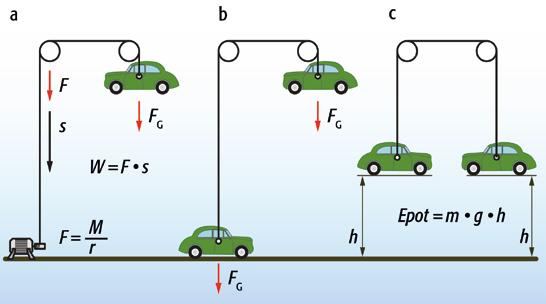 Energiespeicher, also Geräte oder Einrichtungen, welche Arbeit speichern und diese unter gewissen Umständen wieder abgeben können, gibt es in vielen physikalischenTeilgebieten und auch in der Chemie. So stammen die bisher beschrieben Beispiele aus dem physikalischen Gebiet der Mechanik. In der Mechanik gibt es auch noch den Schwungradspeicher. Diesen kann man sich vorstellen, wenn im Bild 5b das unten stehende Auto eben durch ein sehr schweres Schwungrad ersetzt wird. Das Schwungrad wird durch das herunterfallende Auto beschleunigt und die potenzielle Energie des Autos