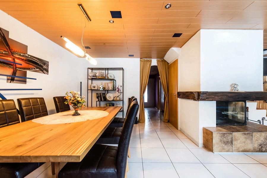 Der lichtdurchflutete Wohn- und Essbereich überzeugt mit grosszügigen Platzverhältnissen und einem gemütlichen Cheminée, das an kühlen Tagen eine behagliche Atmosphäre schafft. Die funktionale Küche bietet reichlich Stauraum und fügt sich harmonisch in das Raumkonzept ein.