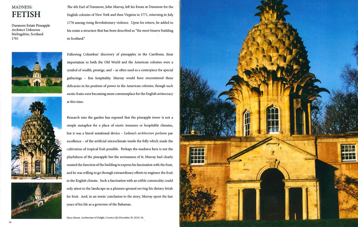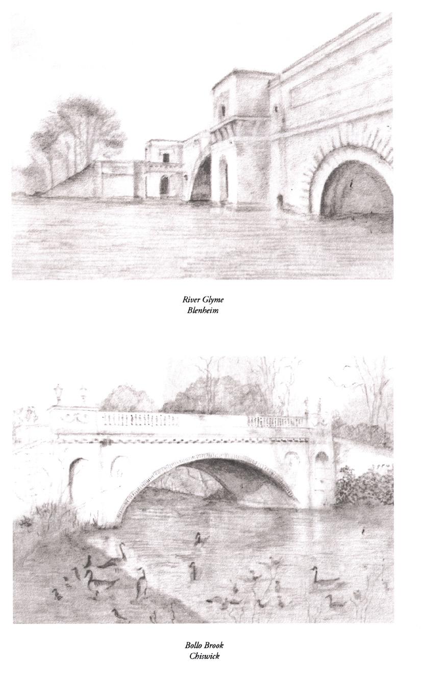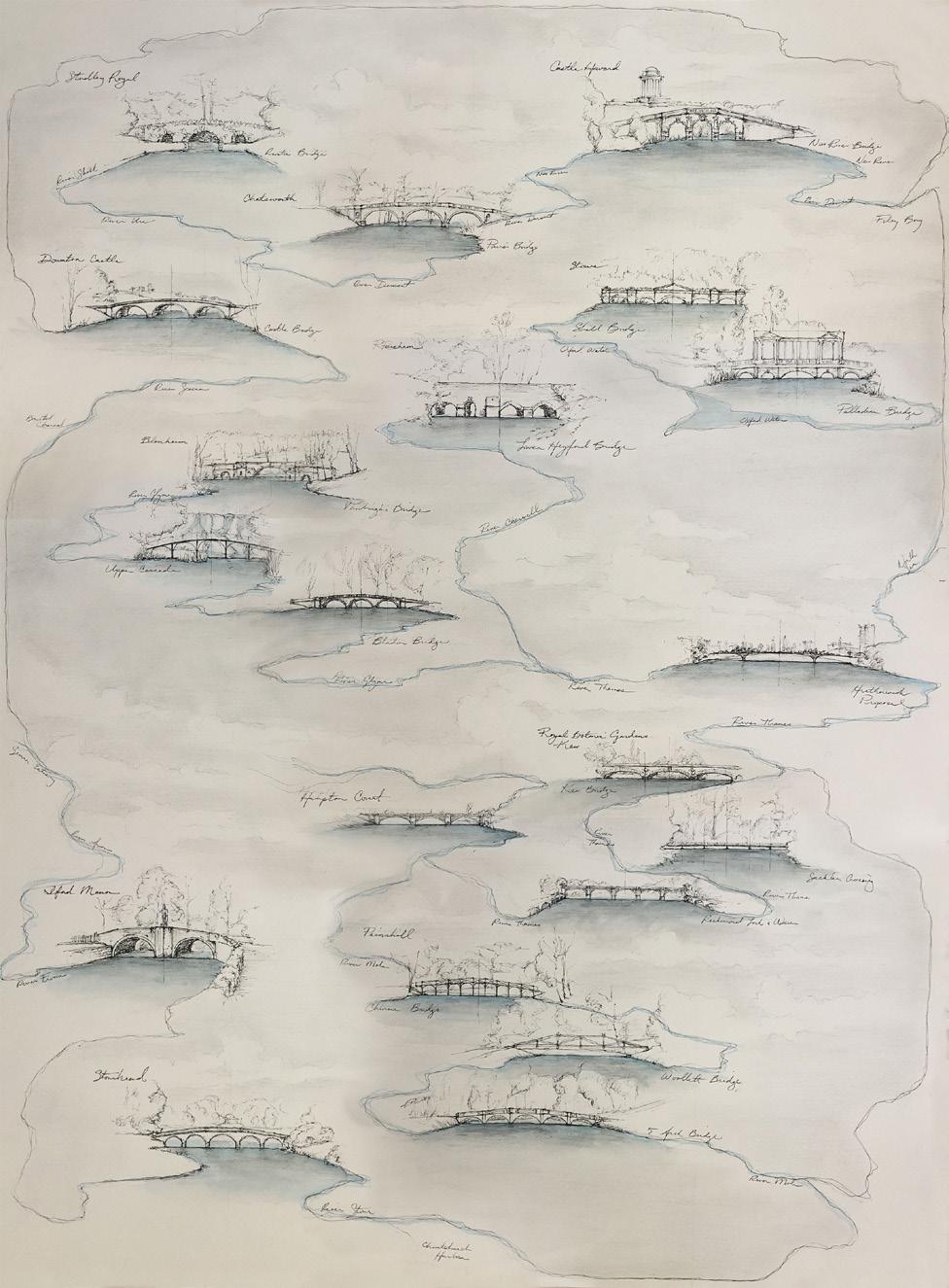 “Ranging from only a few meters to over 200 meters, the bridges of English gardens are drawn to the same size, eliminating shifts in monumentality in order to highlight their individual character. The bridges are composed on the page geographically and linked through the rivers over which they span, including the New River, and Rivers Glyme and Thames. The interconnection of the bridges through their respective bodies of water eclipse the distinct boundaries of the garden estates.”