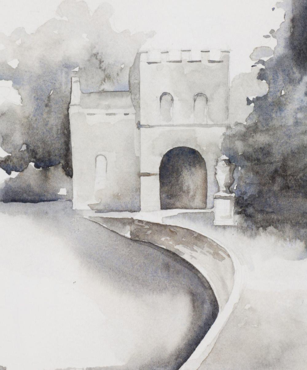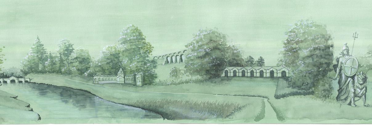 The beautifully rendered drawing in pencil and watercolor, measuring 21” x 55”, is a collage which reads bottom upwards a terrace with balustrades through which Vanbrugh’s bridge at Blenheim is rendered, a garden wall with the Beaufort Classical gate by Inigo Jones moved to Chiswick by Lord Burlington in the central bottom half, through the opening of which can be seen across a lake the Temple of Apollo at Stourhead with scenes above it of the Pantheon at Stourhead on the left, St. Peter’s church, Stourhead in the middle, the Privy Garden at Hampton Court on the right, and above these the Pyramid, Castle Howard on the left, the Temple of Ancient Virtue, Stowe in the middle, the Palladian bridge, Stourhead on the upmost left and the British countryside at the top right.