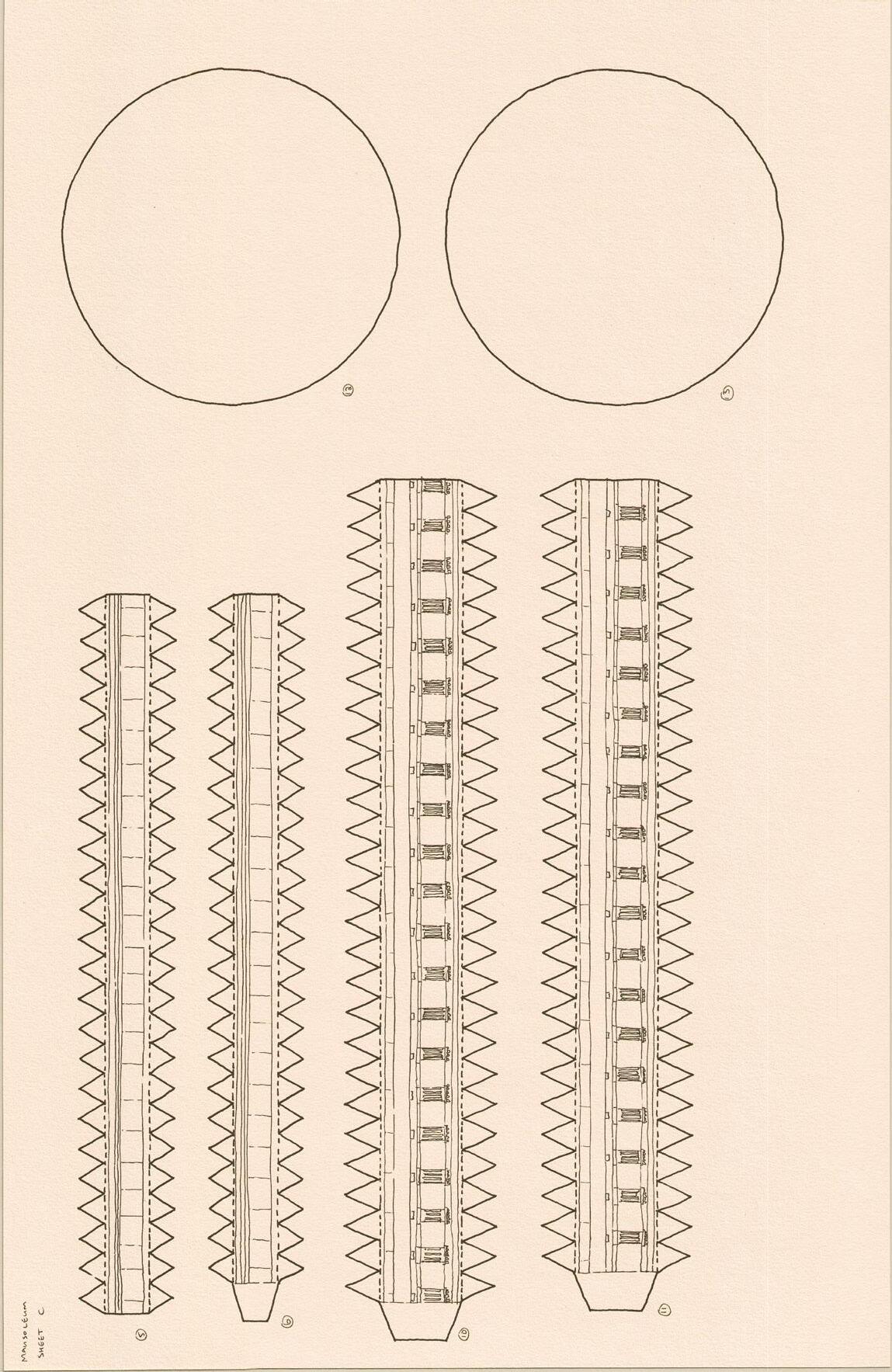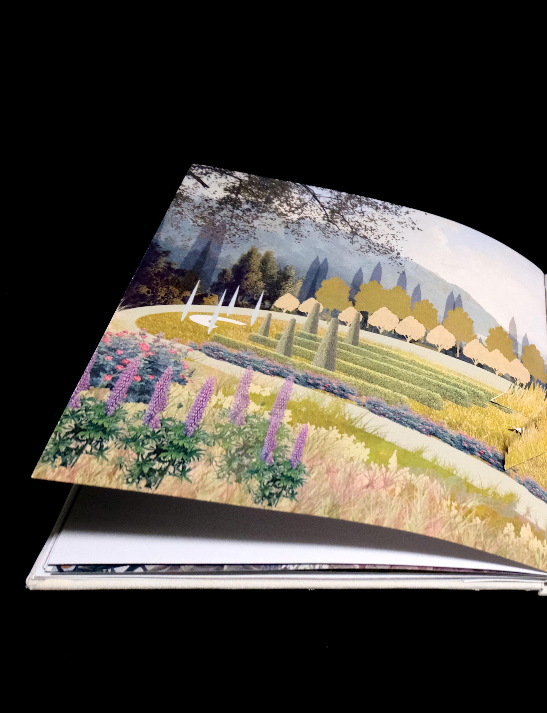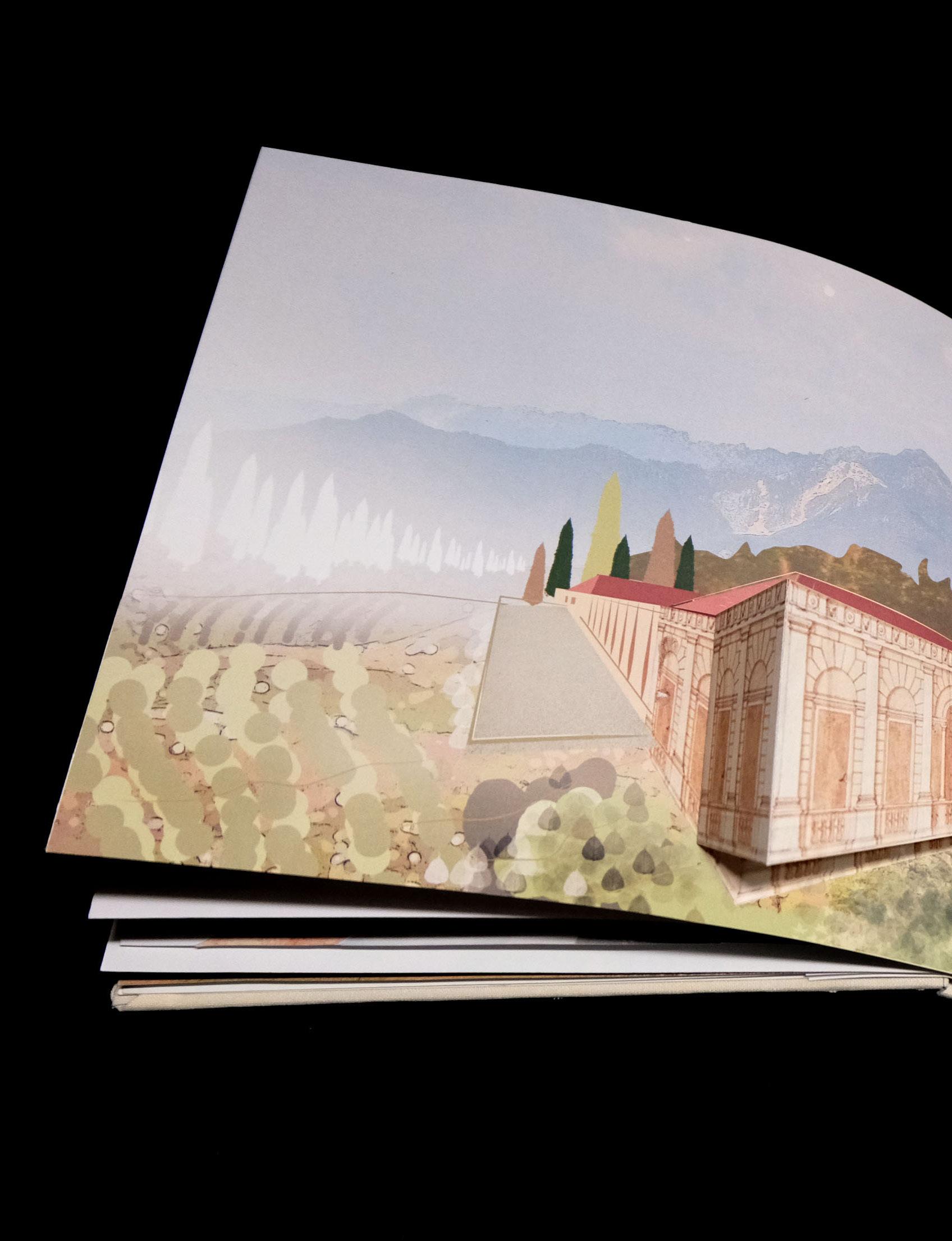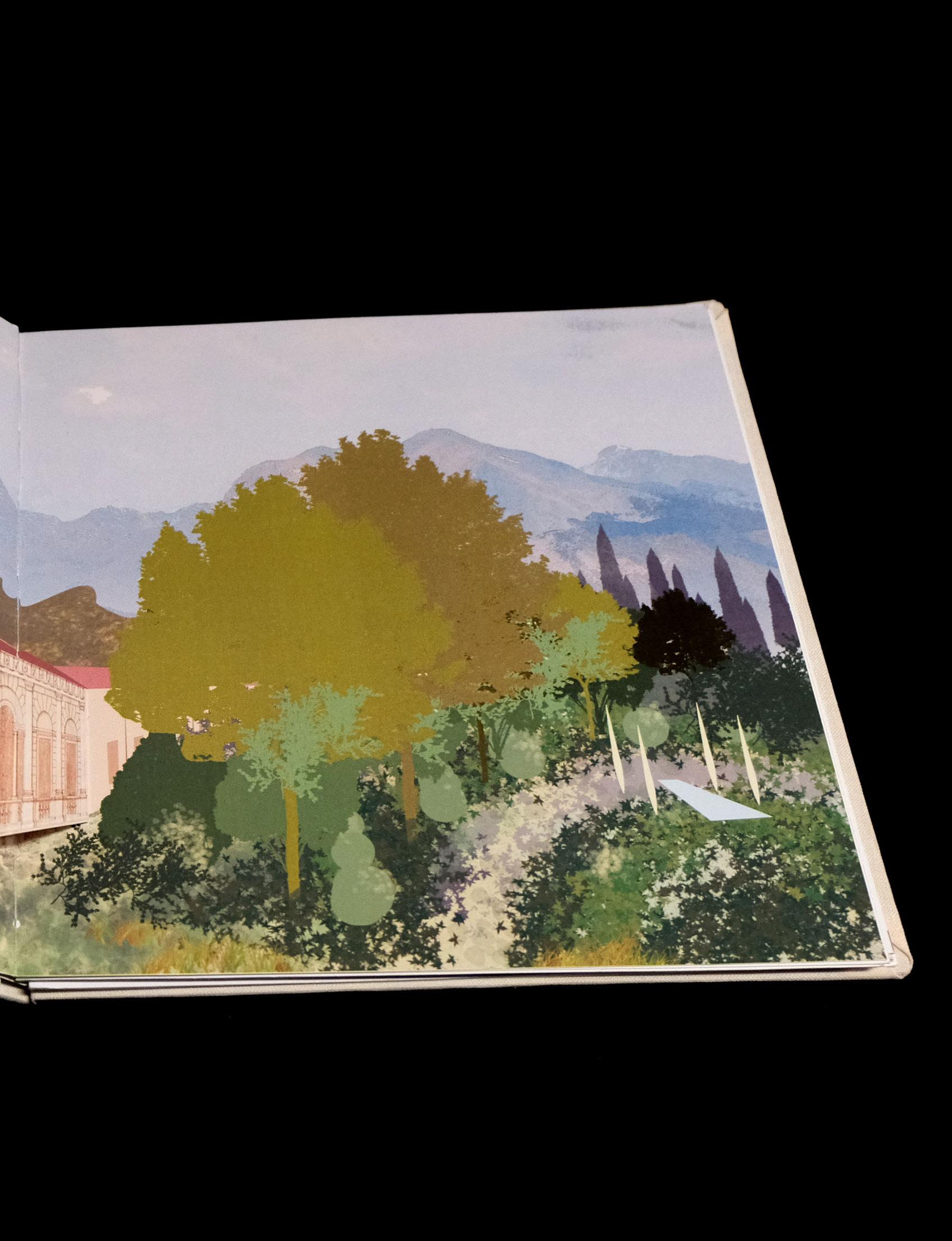 A pop-up book of scenes of Pliny’s Tuscan Villa described in The Letters of the Younger Pliny uses forced perspectives and layering to create depth of scenery. Included in these pages in sequence are Pliny’s colonnade, a view of the wider landscape which incorporates Karl Freidrich Schinkel’s interpretative drawing of the Villa, the extension of the bath complex, the stibadium with its pool of water, and the famous Hippodrome garden.