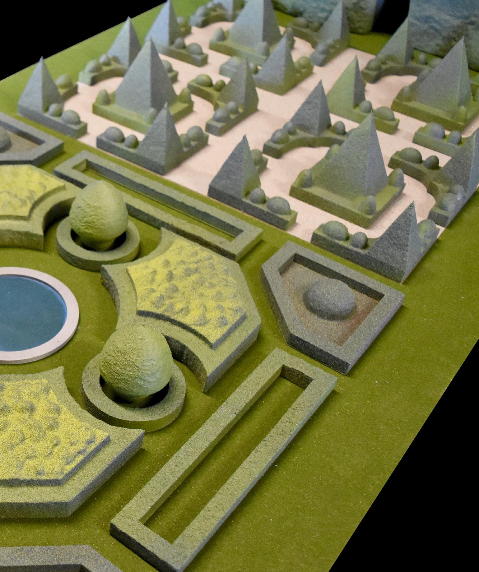 The large model of an original design emphasizes the importance which topiary and hedging play in the gardens of England.