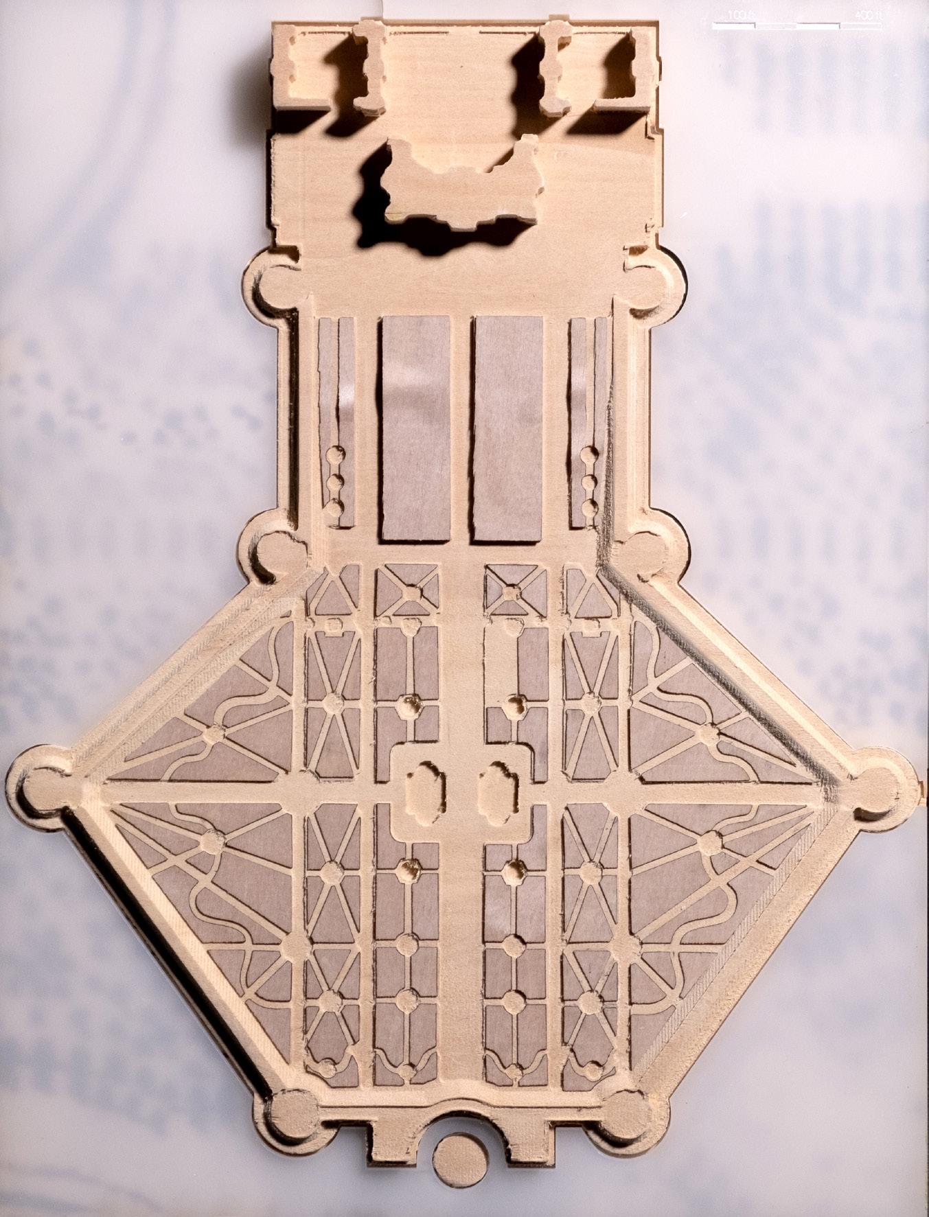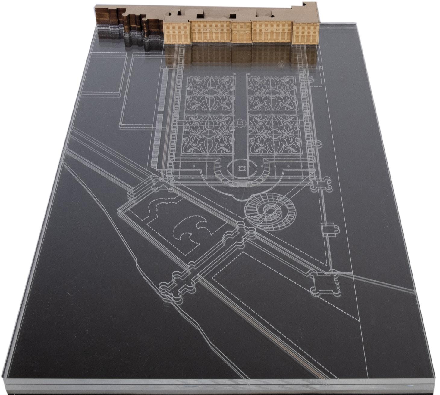 The project consists of four engraved plexiglass plates, each representing one period in the design of the Privy Garden at Hampton Court during the reigns of Henry VIII, Charles I, Charles II, and William III, placed on top of each other and in alignment with a wooden model of Hampton Court Palace which disassembles to show its own historical transformations. In lifting off or adding on each plate one can go back and forth in time to see how a garden, albeit a kingly garden, changes over time but always within the same boundaries.