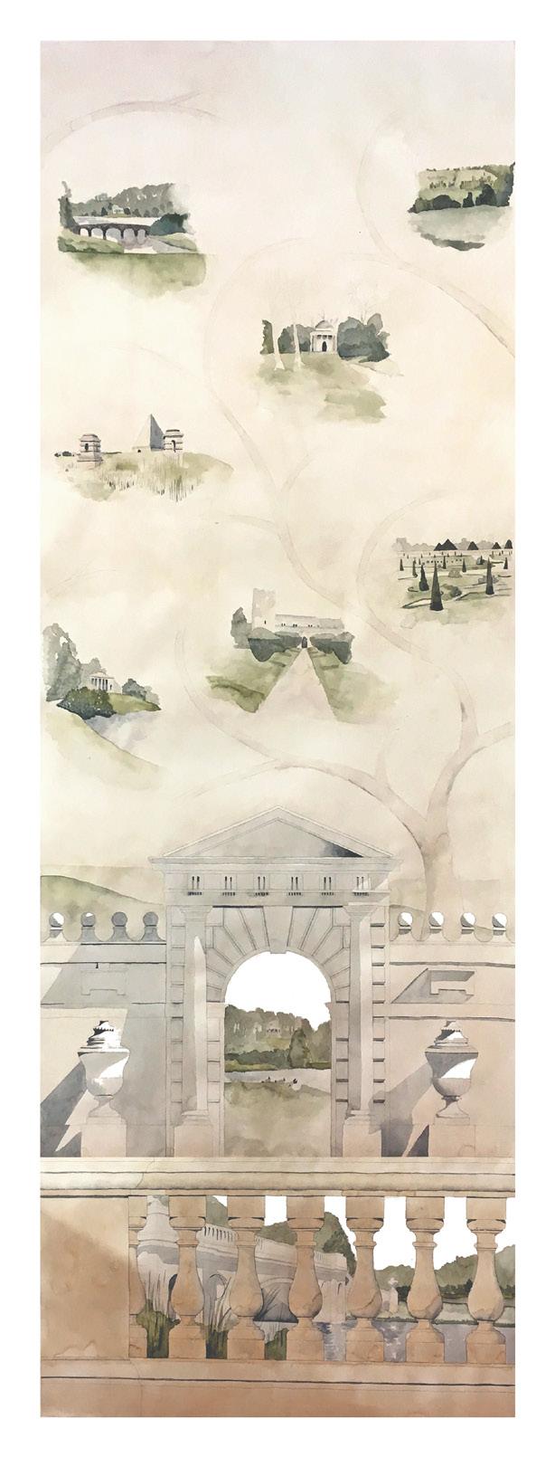 This project is a painted wallpaper frieze that depicts a panoramic rendering of British landscape monuments and buildings seen on a class trip to England and placed next to their historical precedents. Hence, Nicholas Hawksmoor’s Pyramid at Castle Howard sits on its hill in front of the Pyramids of Egypt or Sir John Vanbrugh’s Temple of the Four Winds at Castle Howard below the Villa Rotunda. To reinforce the historicist spirit of her frieze, Gina includes several animated figures in ancient Roman garb, large in scale, marching through the British landscape.