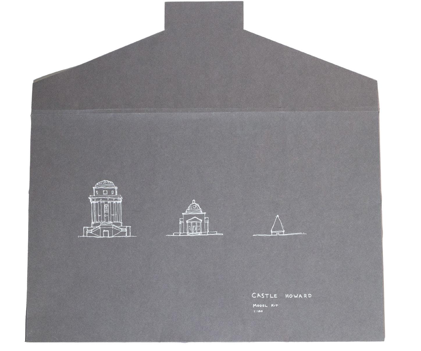 A build-your-own model kit containing the Mausoleum (assembled), Temple of the Four Winds, and Pyramid at Castle Howard.