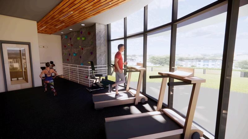 D. Fitness center complete with locker room and rock climbing wall