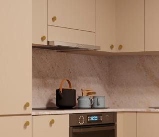 Keittiön kaapistoissa värinä on pehmeä beige, työtason ja välitilansävynä upea marmori. Vetiminä ovat trendikkäät messinkinupit. Lattia on hieman sävytetty, hyvin moneen makuun sopiva melko luonnollinen valkokuultava tammi. Kylpyhuoneen seinä ja lattialaatoissa korostuu hiekkamainen, sävyltään aina ajaton ja kodikas beige. Vilja-tyylin kylpyhuoneen tehosteena käytetään valkoista pystysuuntaista sauvamaista laattaa, jossa on kiiltävä ja elävä pinta.
