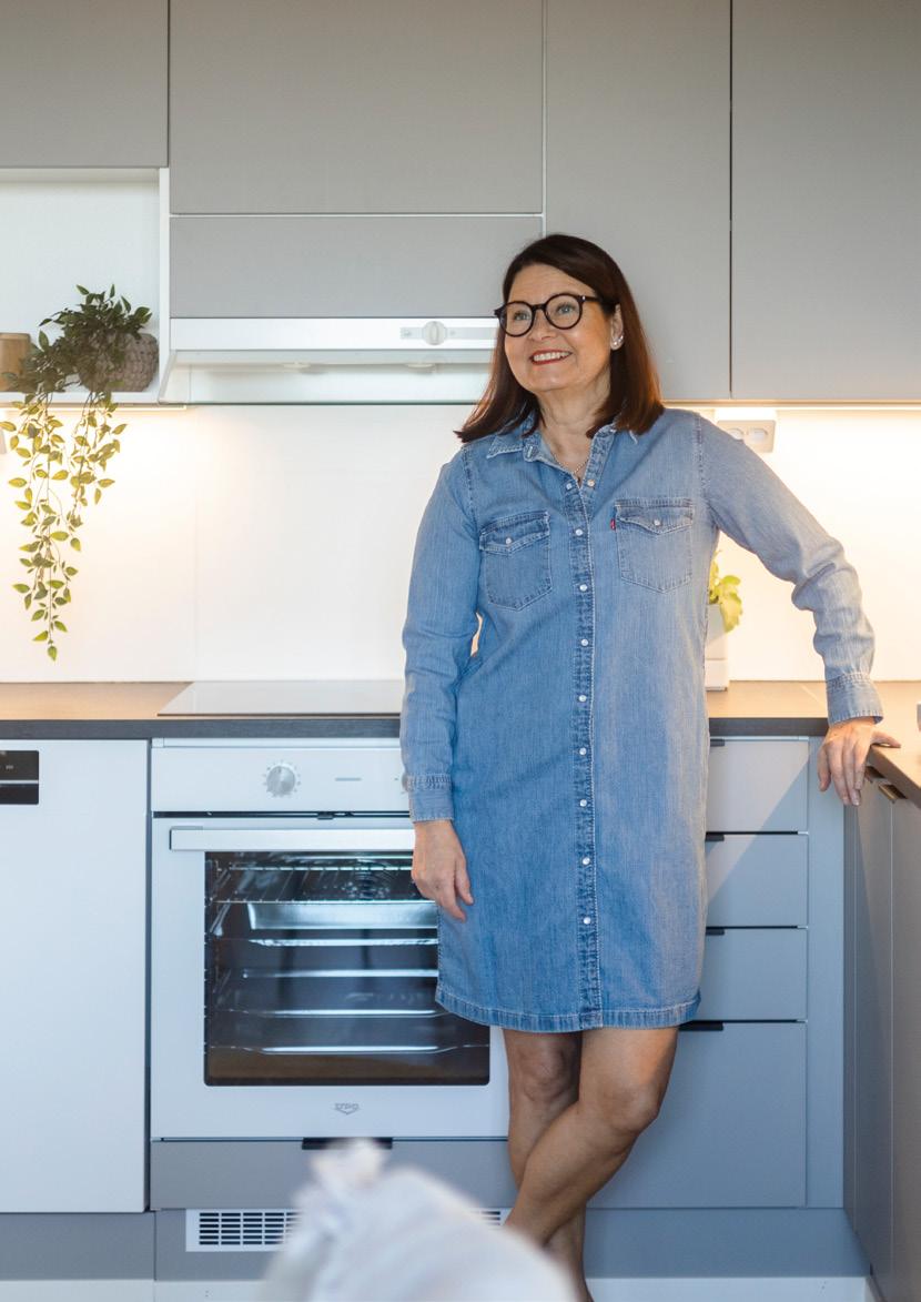 Kallio-tyylin keittiön yksilöllinen ilme syntyy kontrastista, jossa betoninharmaat kaapistot luovat vahvan yleisilmeen, mustat tasot tuovat arvokkuutta ja valkoinen välitila valoa. Yläkaapit toimivat ilman vetimiä ja alaosaan on lisätty mustat listavetimet. Lattiaksi on valittu hyvin vaalea moneen makuun sopiva, harmaaseen taittava tammikuvio.