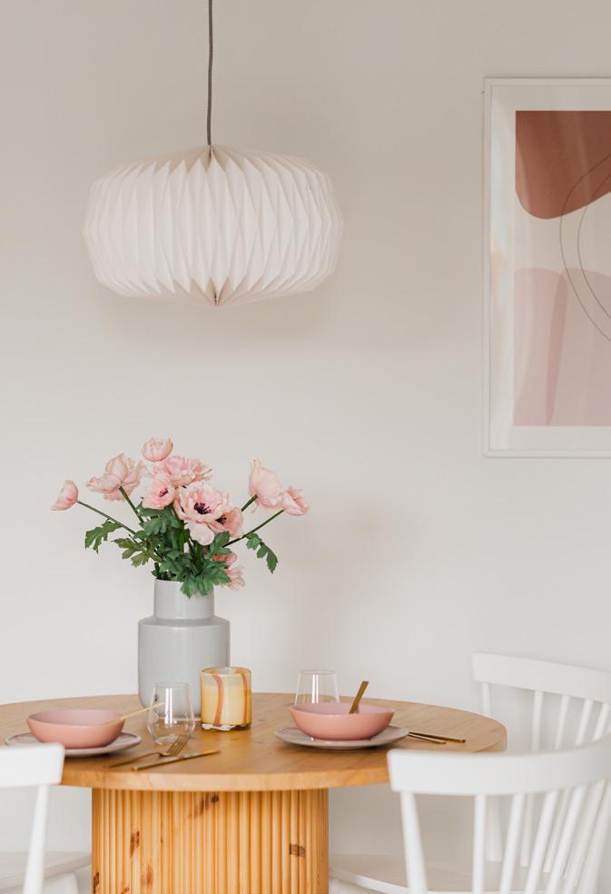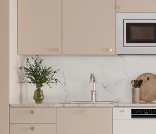 Keittiön kaapistoissa värinä on pehmeä beige, työtason ja välitilansävynä upea marmori. Vetiminä ovat trendikkäät messinkinupit. Lattia on hieman sävytetty, hyvin moneen makuun sopiva melko luonnollinen valkokuultava tammi.