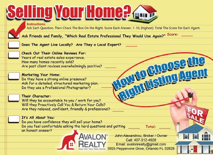 LOCAL MARKET KNOWLEDGE: An experienced agent knows your local market inside and out. For example, would you hire someone who has 23 years of experience selling homes in and around Avalon Park, or someone with little or no experience here? John Alexandrou and Avalon Realty were the first real estate company established in Avalon Park in 2003.