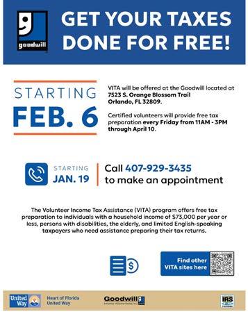 IRS-certified volunteers at Goodwill’s S. Orange Blossom Trail location will be helping families by appointment only every Friday from Feb. 6 through April 10. Walk-ins will not be accommodated.