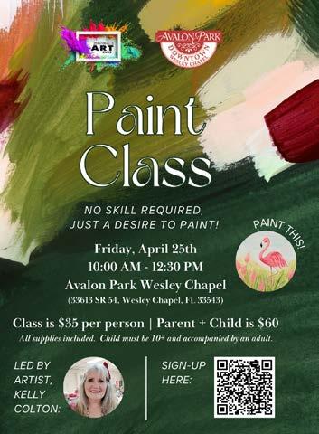 Paint Class with Kelly Colton – Rounding out the art offerings this spring, artist Kelly Colton will teach a relaxed and welcoming paint class on Friday, April 25th from 10:00 AM to 12:30 PM. Held at Avalon Park Wesley Chapel (33613 SR 54, Wesley Chapel, FL 33543), this class is open to anyone with a desire to paint—no experience required. Cost is $35 per person or $60 for a parent and child pair (child must be 10+ and accompanied by an adult). All supplies are included.