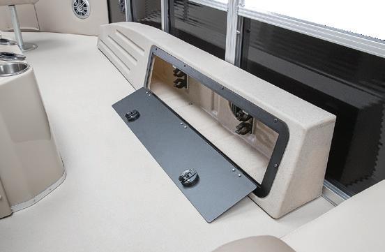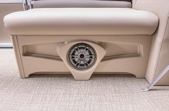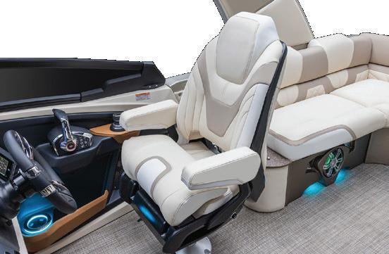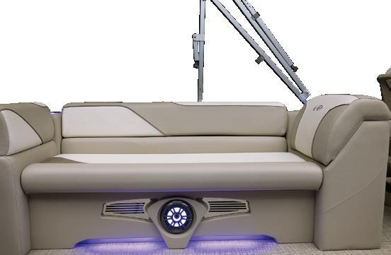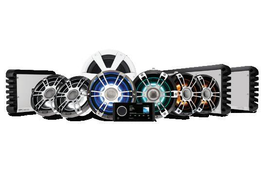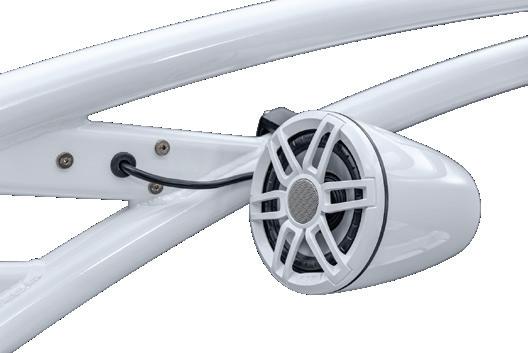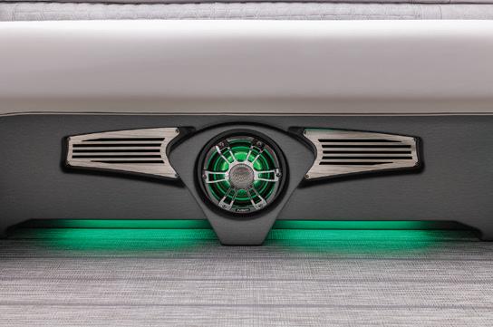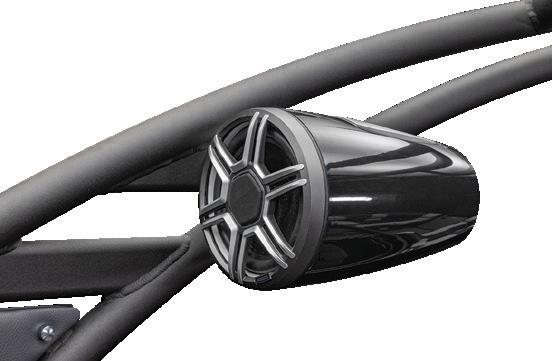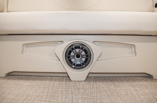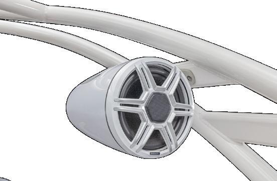 • High performance sound package: Fusion RA-670 radio, (6-8) Fusion XS lighted speakers with grills, Fusion 6-channel amp, & 10” Fusion subwoofer