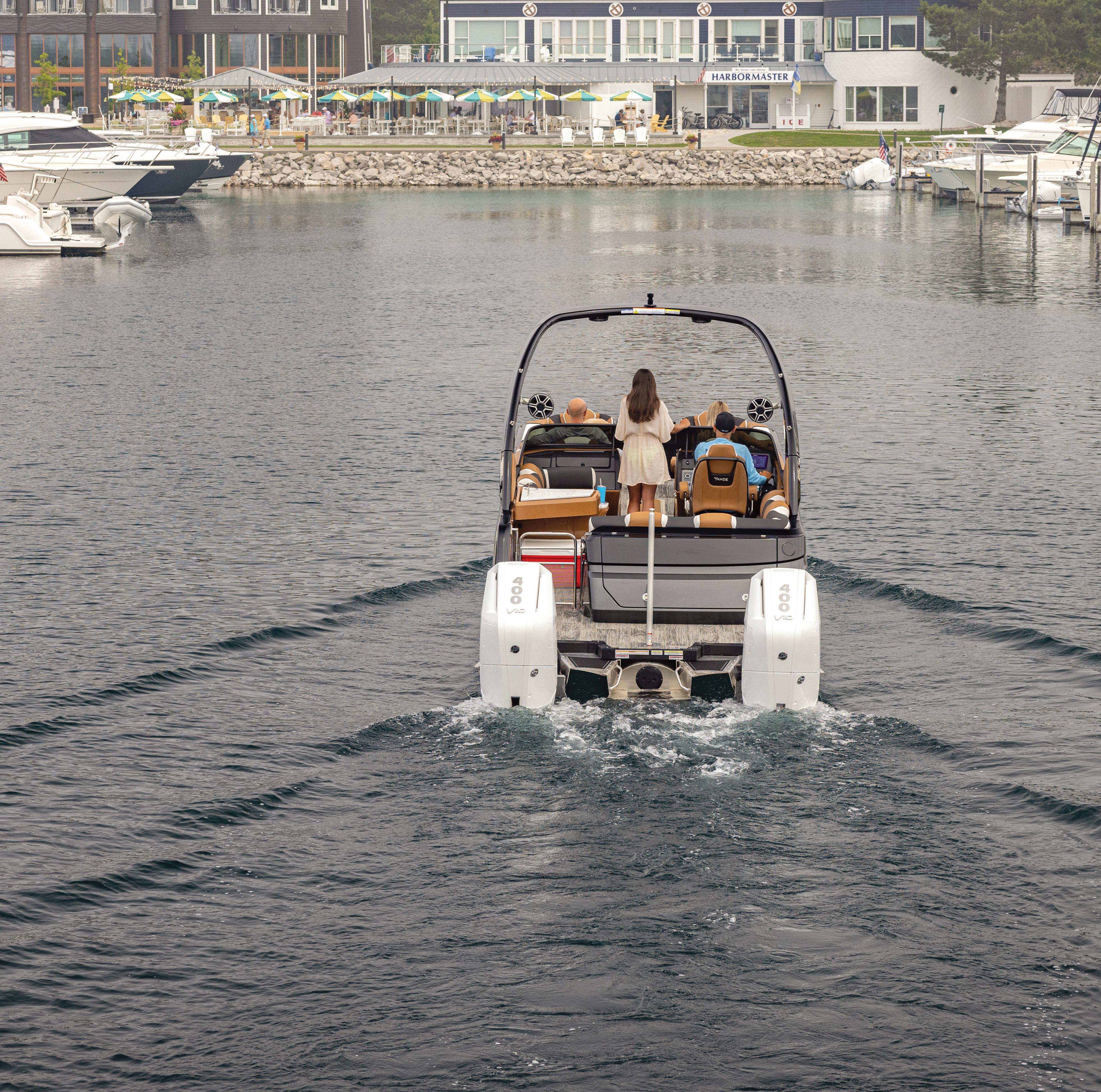 Recommended for those desiring an economical 150HP - 250 HP equipped boat with very good weight and wave handling as well as excellent performance. Includes integrated motor pod, 38-gallon transom direct fill fuel tank, 4 lifting fins, wave shield, ski tow bar and Uflex Protech Steering. MAXIMUM HP RATING IS 250 HP.