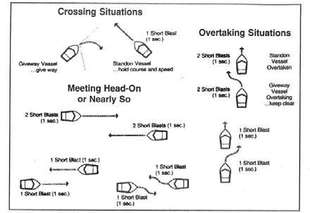 4. Sound Signaling Devices: Regulations do not specifically require vessels less than 12 meters (39.4 feet) to carry a whistle, horn or bell. However, the navigation rules require sound signals to be made under certain circumstances. Meeting, crossing and o vertaking situations described in the "Rules of the Road" section of this manual illustrate when sound signals are required. Recreational vessels are also required to sound fog signals during periods of reduced visibility. Vessels 12 meters or more in leng th are required to carry a whistle or horn and a bell.