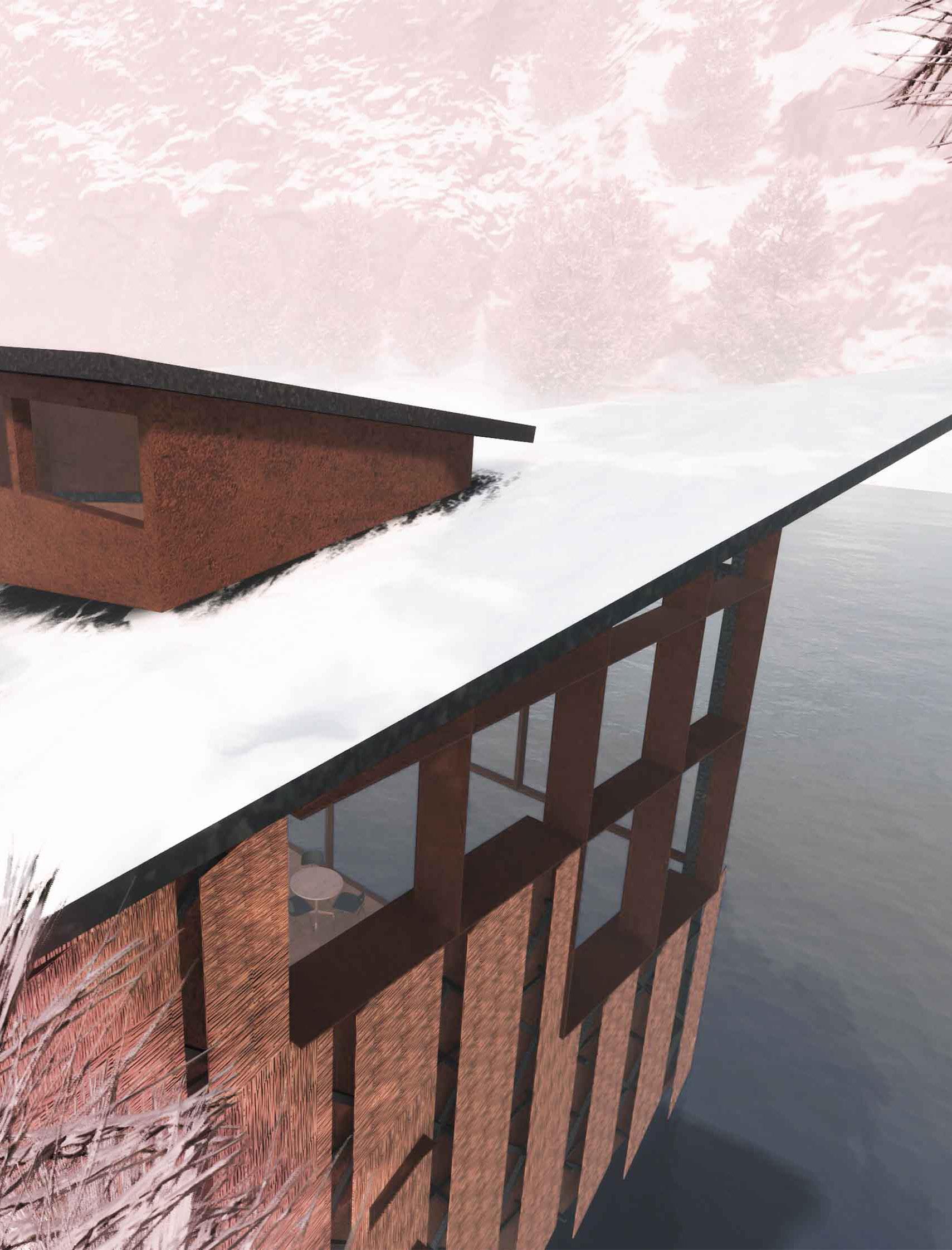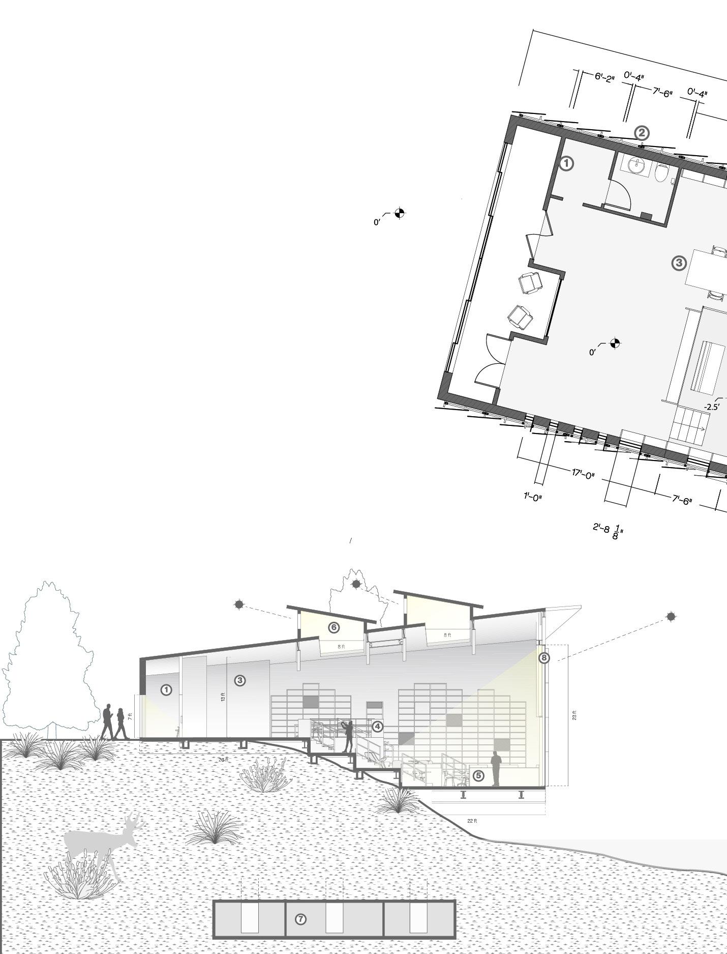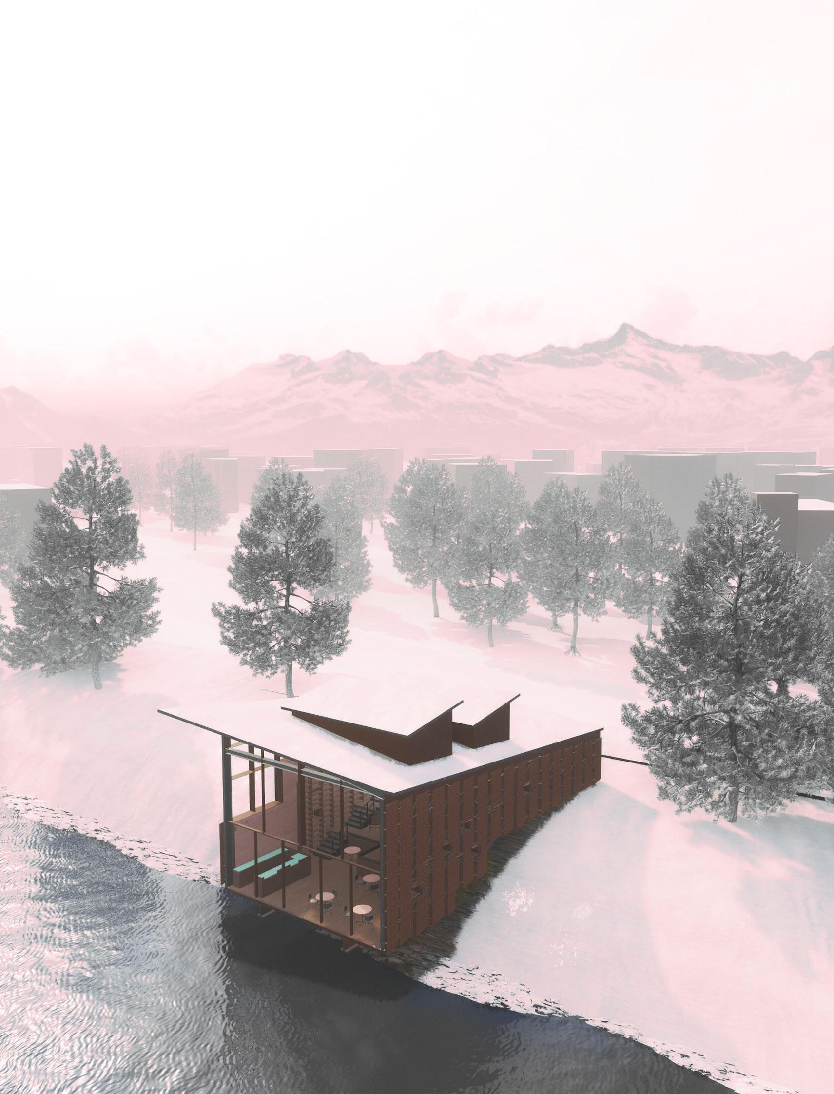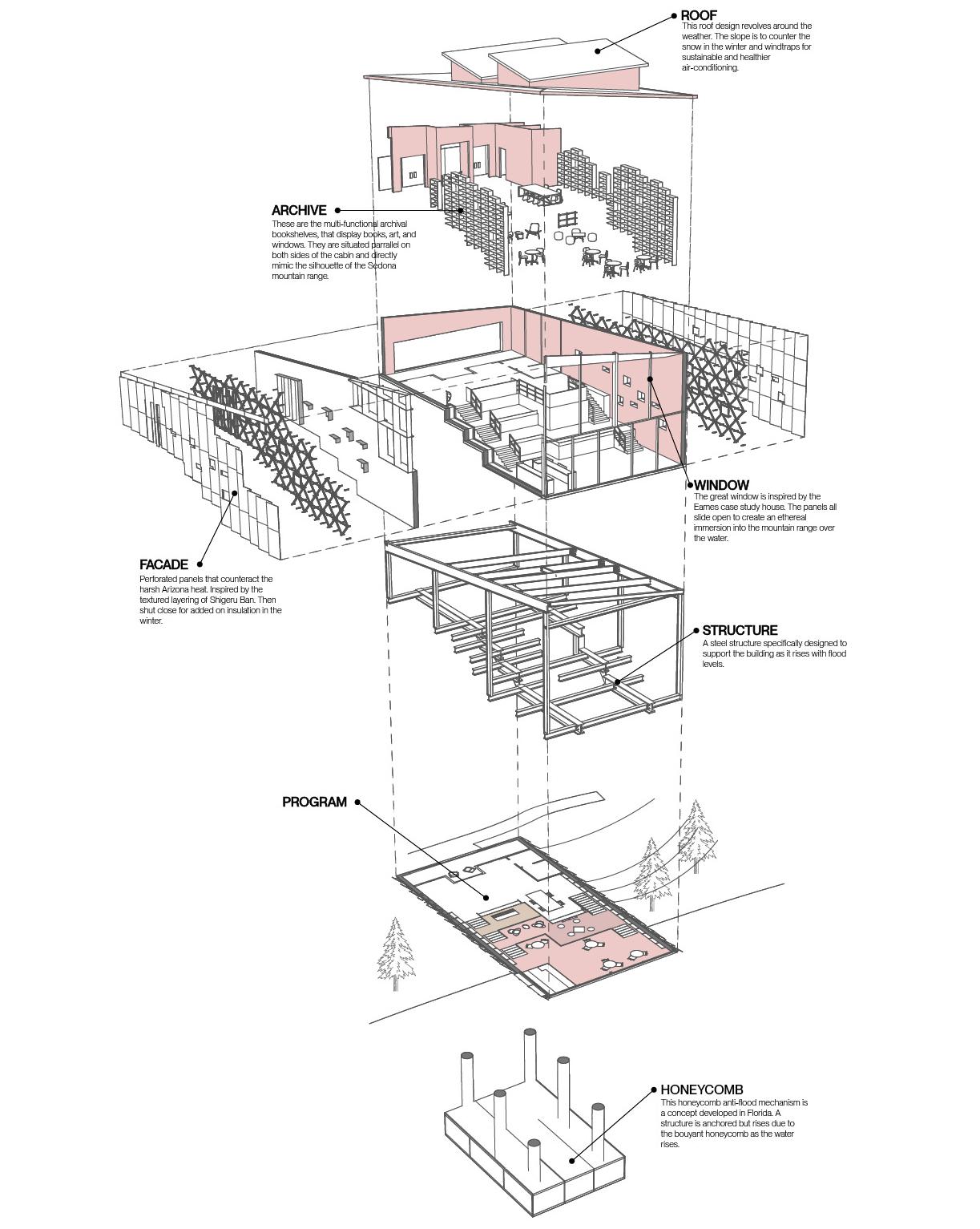 A third year studio project at Arizona State University with Professor Quiara Cagiuat, focused on designing an archival space within a flood zone in Oak Creek, Sedona. Inspired by Renzo Piano’s climate conscious approach to technology and materiality, the building is designed to stay visually quiet so the landscape remains the main focus. Key moves include a grand glazed window, a sloped roof that channels wind into rooftop traps, a responsive facade that moderates sun exposure, and an anti flood honeycomb system that allows the structure to float during high water. The form references Sedona’s sedimentary plateaus, with a layered program that stacks an archival café and lounge below a gallery and coworking spaces above.