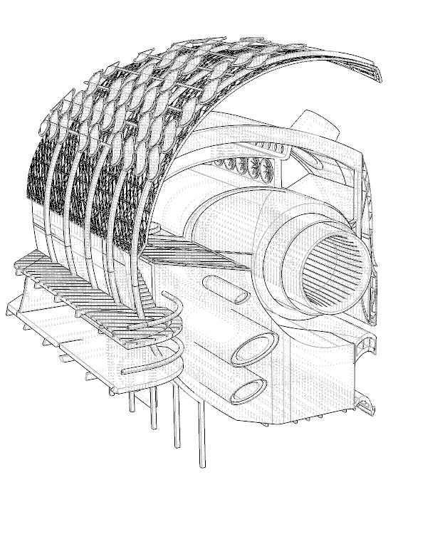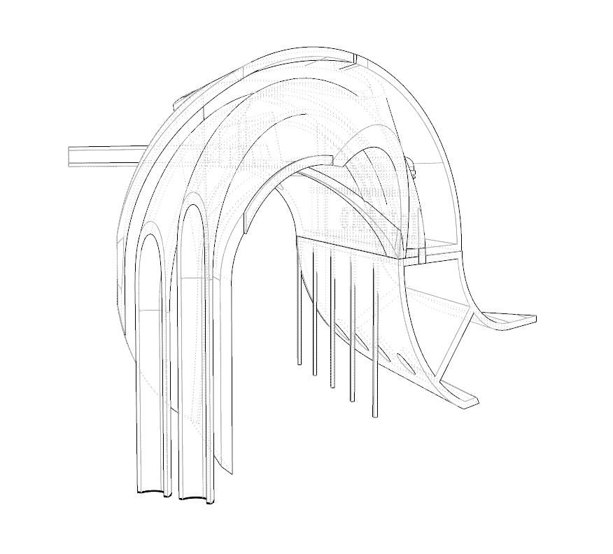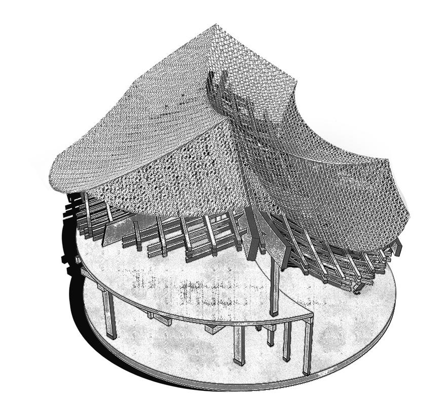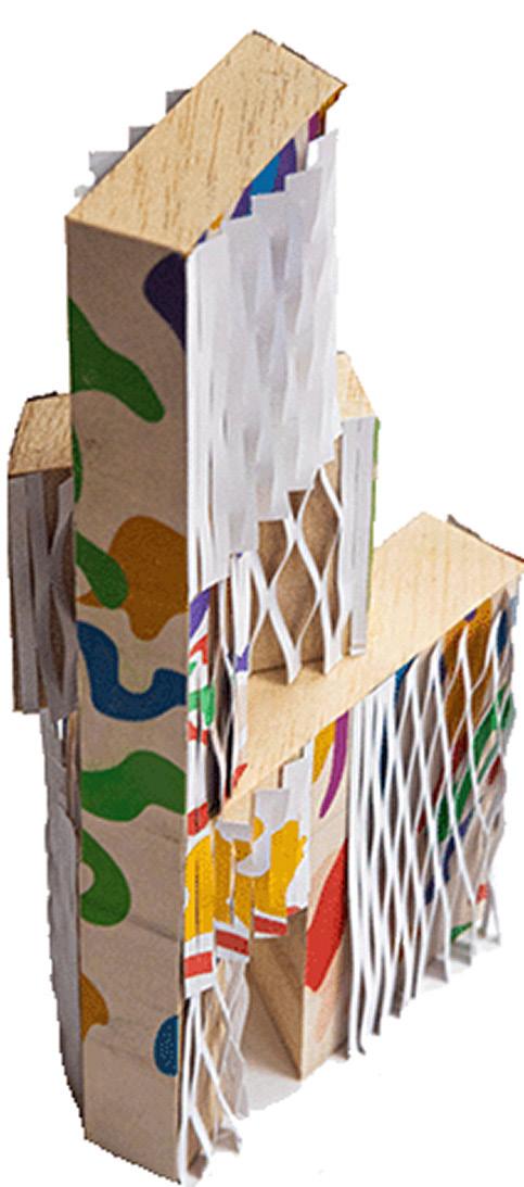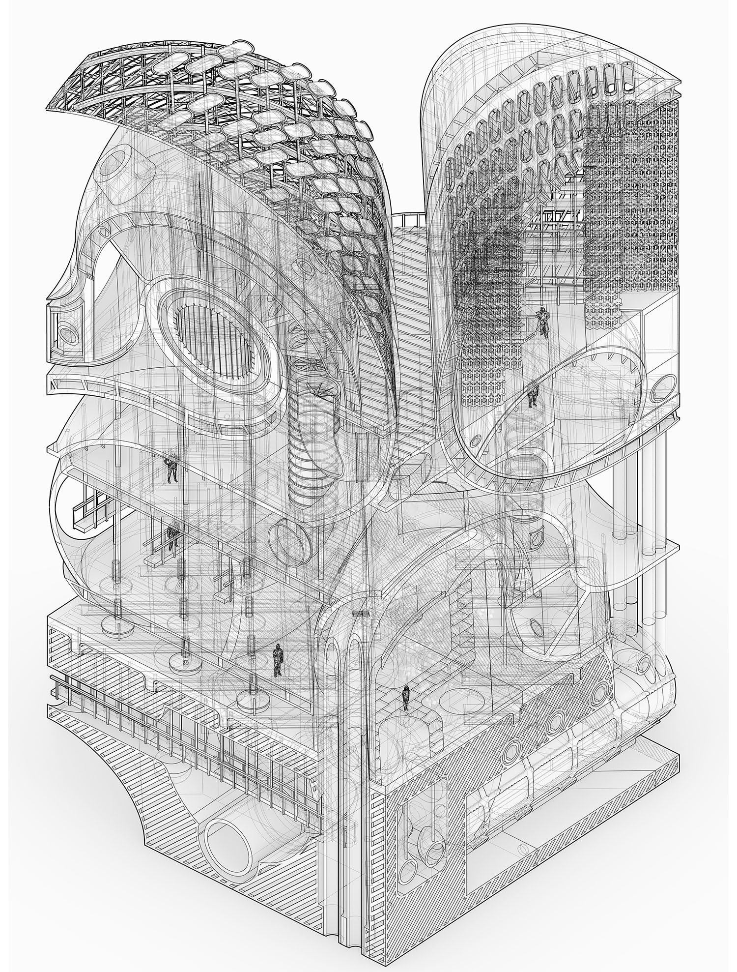 Living / Dying is an ecological living commune that evolves from hands-on physical modeling. We started by cutting wooden dowels into circular forms, creating a wavy through-line that informed the building’s final shape. This form became a framework for integrating a series of natural systems, from photovoltaic solar panels that harvest energy to plant-based air filtration and a mycelium lab growing structural bricks. Here, the relationship is symbiotic: the building thrives with the users’ care, and in return, it sustains its inhabitants. If the caretaking stops, the building ceases to shelter, creating a narrative of mutual dependence and a truly integrated living environment.
