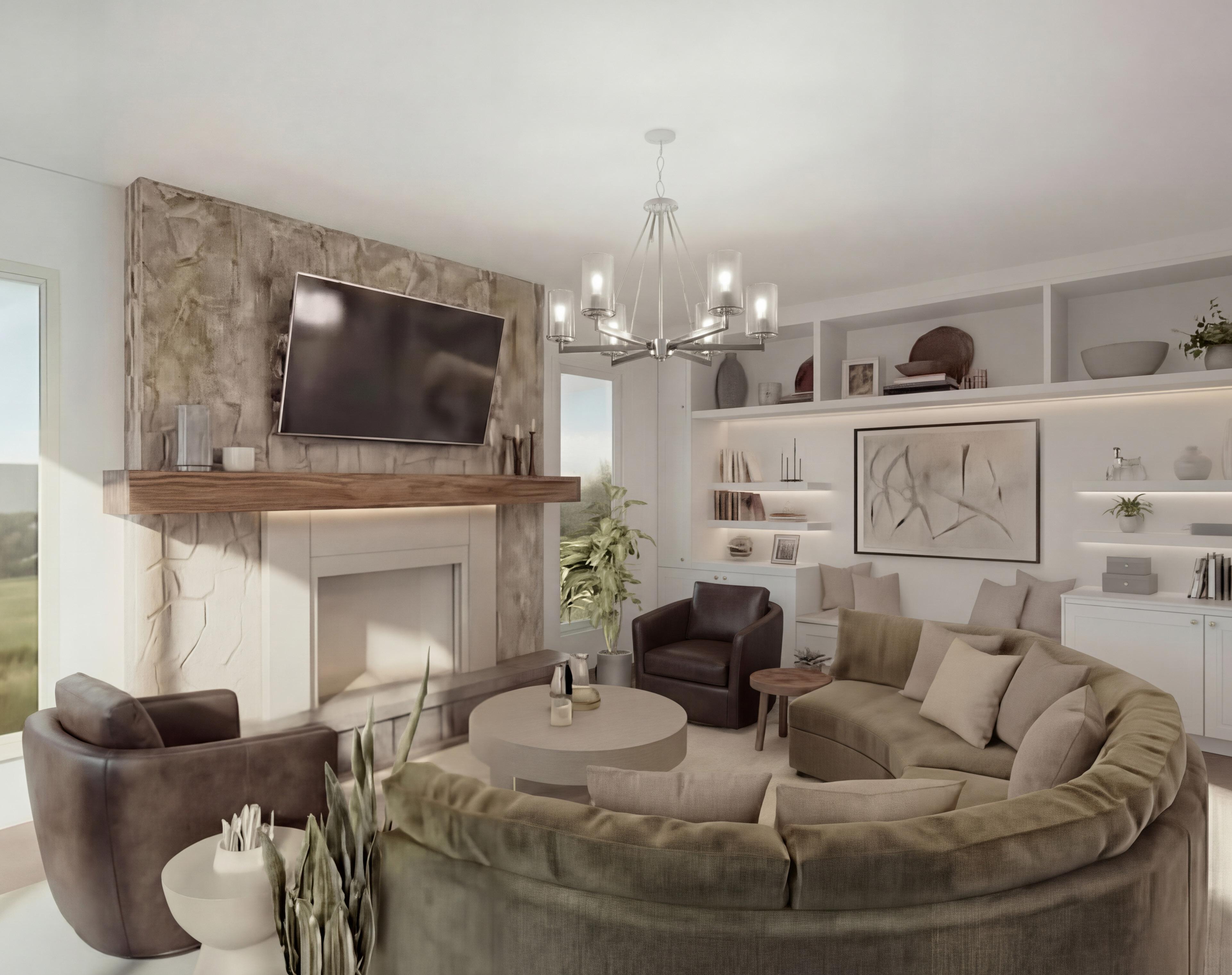 The orientation of the family room will be shifted to face the timeless fireplace. A television will be mounted above the mantle and a curved sofa will be specified to encourage close-knit gathering and maintain a traditional atmosphere in the space. A custom builtin will be placed on the eastern wall for storage and extended seating.