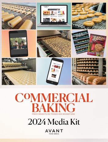Commercial Baking ISSN 2767-5319, / USPS Publication Number: 25350 is published in February, April, June, August, October and December, in print and digital formats by Avant Food Media, 1703 Wyandotte St., Suite 300, Kansas City, MO 64108. Periodicals Postage Paid at Kansas City, MO, POSTMASTER: Send address changes to Commercial Baking, c/o Avant Food Media, 1703 Wyandotte St., Suite 300, Kansas City, MO 64108.