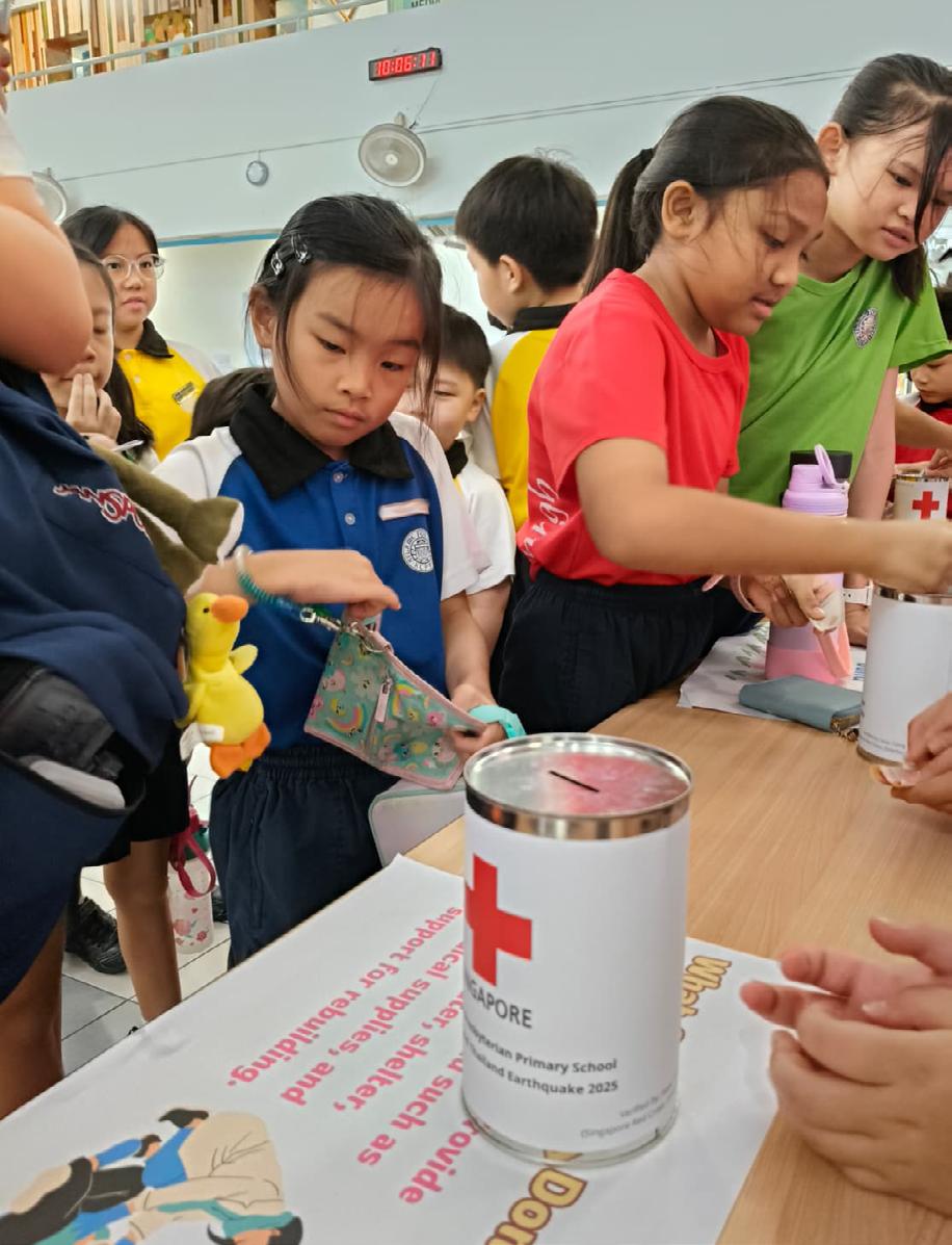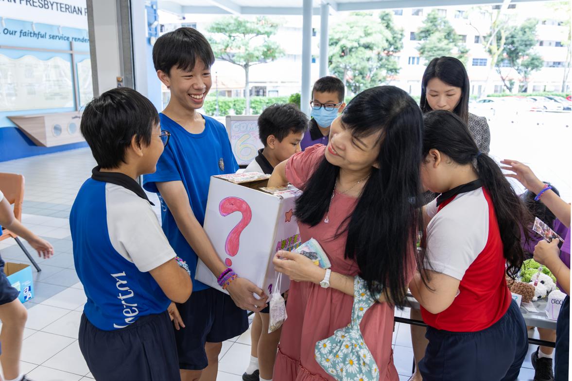 In preparation, pupils collected recyclable materials and upcycled them into unique handmade products such as toys, stationery, decorative pieces, and even jewellery like bracelets. These items became thoughtful tokens of appreciation for pupils from other levels who donated to the cause. During the two-day drive, held across the various recesses, the Pupil Activity Centre (PAC) was transformed into a colourful marketplace filled with creativity and excitement. Besides lending their talents to create the tokens, our Primary 6 pupils also designed eye-catching booth displays, created posters, and even dressed up as mascots to attract their peers to the booths. The event buzzed with energy as pupils from different levels moved from booth to booth, admiring the creative crafts and supporting the meaningful cause.