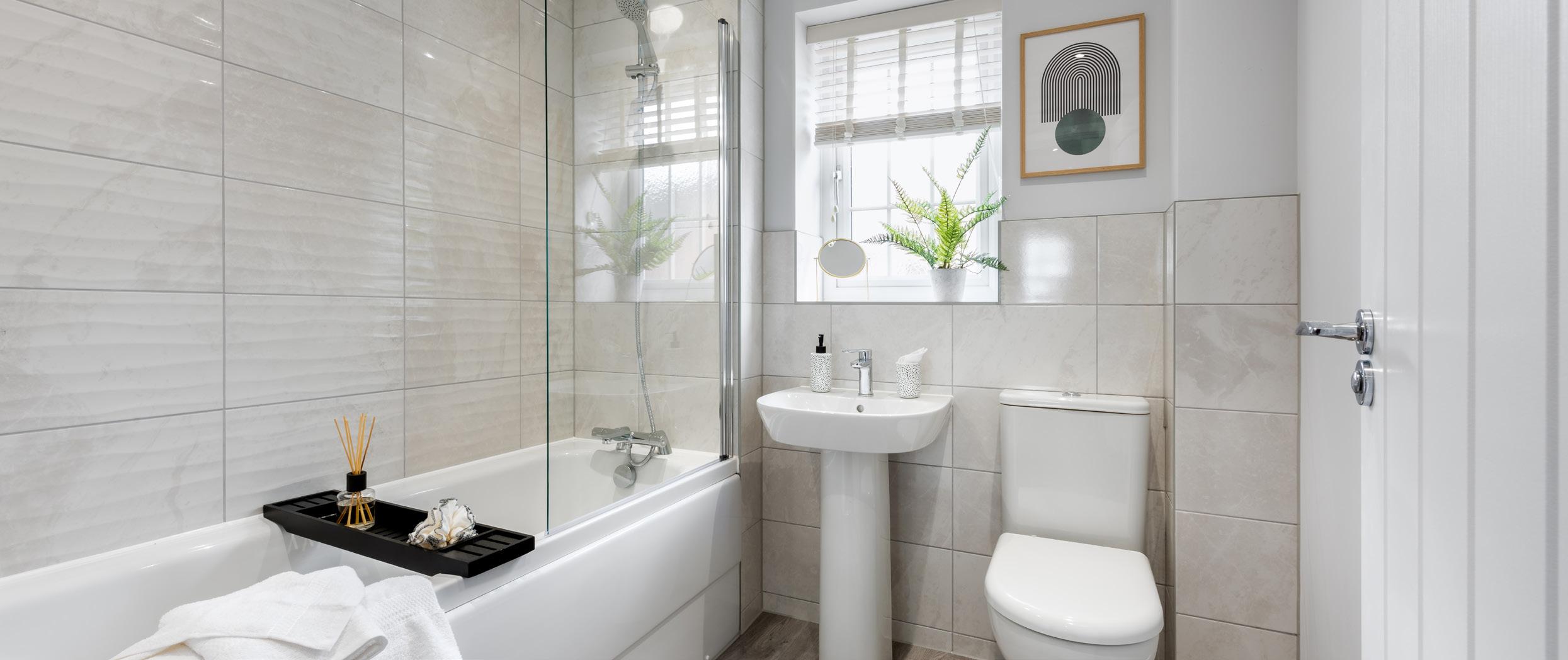 • Full height tiling option to 3 sides of bath and half height tiling behind sink and WC
