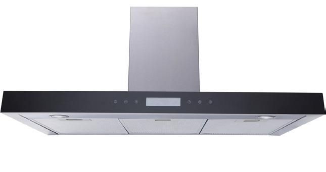 A fashionable stainless steel cooker hood with a touch control black glass panel and three speed settings.