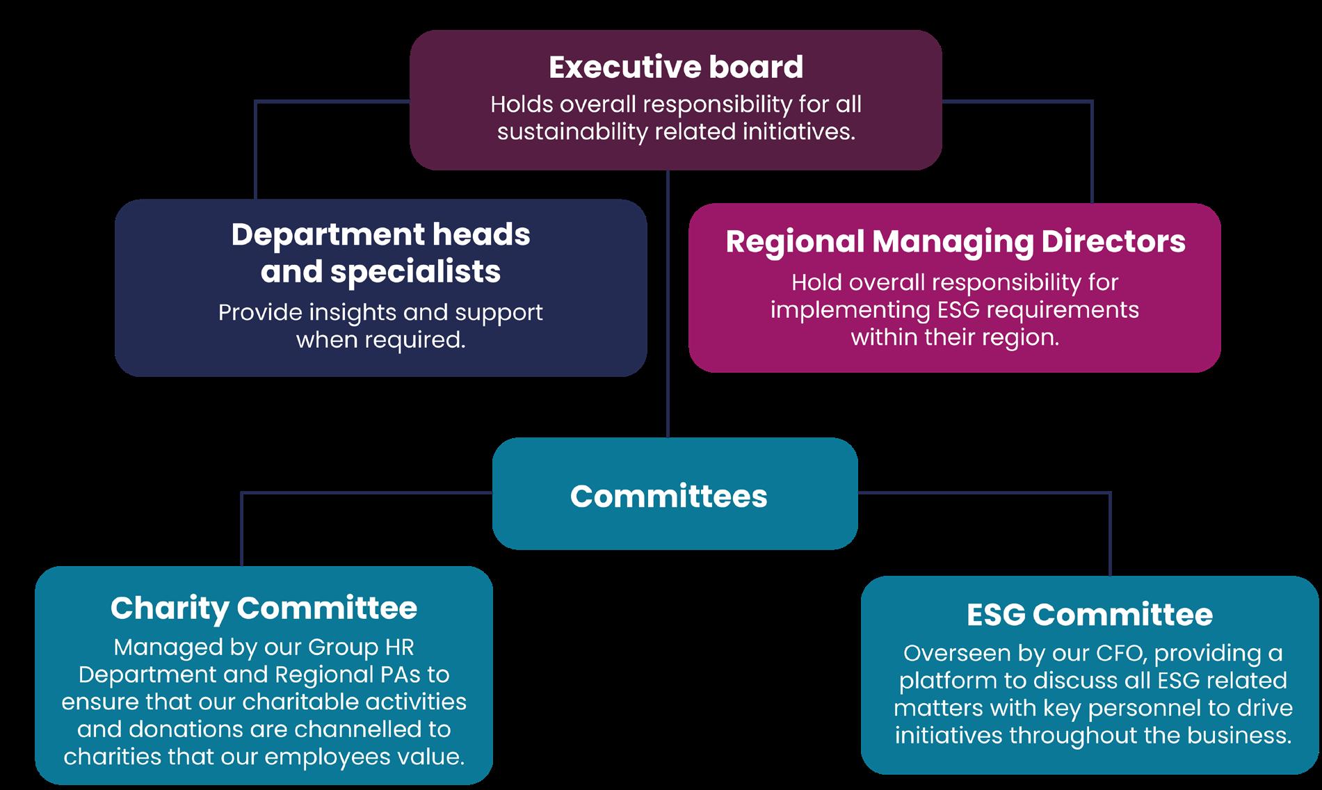 In addition, we have committees whose duties support our sustainability strategy. The first is our charity committee which is managed by our Group HR Department and Regional Personal Assistants to ensure that our charitable activities and donations are channelled to charities that our colleagues value.
