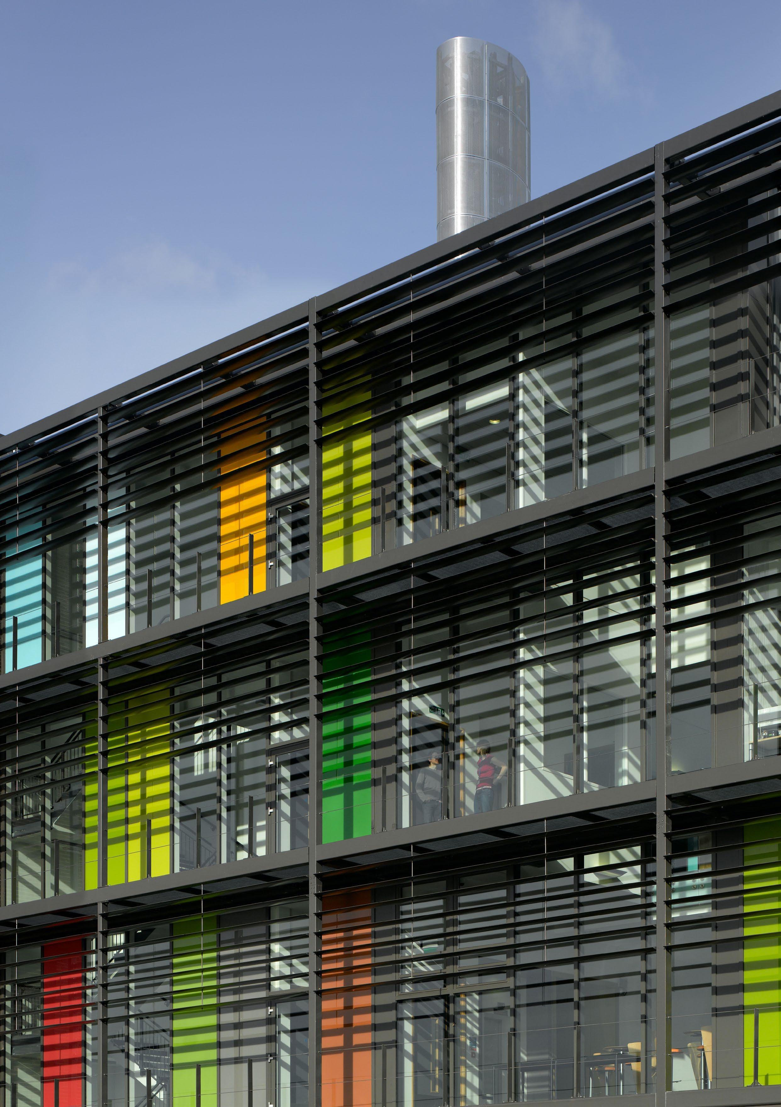 The building achieved a BREEAM Excellent sustainability award and includes a site-wide art strategy animating shared spaces including the toplit central atrium. The design of the building set the template for the future phases, animated by a shared language of brick, shading elements and coloured glazing.