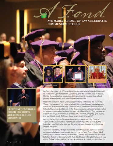 President and Dean Kevin Cieply welcomed and addressed the students. “Being courageous is not being unafraid. It is going forward even when you are afraid,” the Dean reflected. “Class of 2016, the essence of Ave Maria School of Law is embodied not in the three years you just experienced, rather its essence lies in what is ahead for you,” said Dean Cieply. “God has seeded in each one of you tremendous and beautiful wisdom, integrity, grit, loyalty, and a will to do good. Cultivate it and share it with the world.” Among the highlights of the event was a touching speech by Class of ’16 Student Speaker, Shea Hasenauer, and an impactful speech by the legendary Lou Holtz who was our Commencement Speaker and Honorary Degree Recipient. “Everyone needs four things in your life: something to do, someone to love, someone to believe in and something to hope for,” said Coach Holtz. “God didn’t put you on this earth to be average.” “There’s only three rules you have to follow: Rule #1, Do what’s right. Rule #2, Do everything to the best of your ability. Rule #3, Genuinely show people you care. Above all, put your faith in