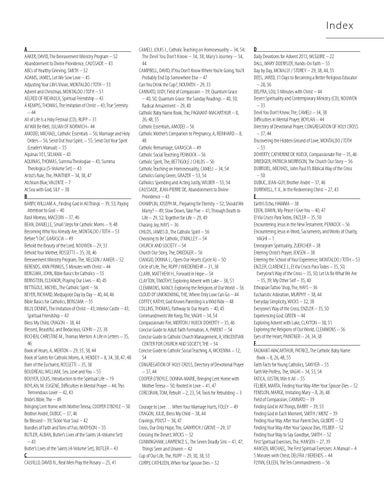 Index A AAKER, DAVID, The Bereavement Ministry Program – 52 Abandonment to Divine Providence, CAUSSADE – 43 ABCs of Healthy Grieving, SMITH – 52 ADAMS, JAMES, Let Me Sow Love – 45 Adjusting Your Life’s Vision, MONTALDO / TOTH – 53 Advent and Christmas, MONTALDO / TOTH – 51 AELRED OF RIEVAULX, Spiritual Friendship – 43 À KEMPIS, THOMAS, The Imitation of Christ – 43; True Serenity – 44 All of Life Is a Holy Festival (CD), RUPP – 31 All Will Be Well, JULIAN OF NORWICH– 44 AMODEI, MICHAEL, Catholic Essentials – 56; Marriage and Holy Orders – 56; Send Out Your Spirit, – 55; Send Out Your Spirit (Leader’s Manual) – 55 Aquinas 101, SELMAN – 43 AQUINAS, THOMAS, Summa Theologiae – 43; Summa Theologica (5-Volume Set) – 43 Artist’s Rule, The, PAINTNER – 34, 38, 47 Atchison Blue, VALENTE – 7 At Sea with God, SILF – 38 B BARRY, WILLIAM A., Finding God in All Things – 39, 53; Paying Attention to God – 40 Basil Moreau, MACEOIN – 37, 46 BEAN, DANIELLE, Small Steps for Catholic Moms – 9, 48 Becoming Who You Already Are, MONTALDO / TOTH – 53 Before “I Do”, GARASCIA – 49 Behold the Beauty of the Lord, NOUWEN – 29, 33 Behold Your Mother, ROSSETTI – 35, 38, 46 Bereavement Ministry Program, The, NELSON / AAKER – 52 BERENDS, ANN PRIMUS, 5 Minutes with Christ – 44 BERGSMA, JOHN, Bible Basics for Catholics – 55 BERNSTEIN, ELEANOR, Praying Our Lives – 40, 45 BETTIGOLE, MICHEL, The Catholic Spirit – 56 BEYER, RICHARD, Medjugorje Day by Day – 40, 44, 46 Bible Basics for Catholics, BERGSMA – 55 BILLY, DENNIS, The Imitation of Christ – 43; Interior Castle – 43; Spiritual Friendship – 43 Bless My Child, CRAGON – 38, 44 Blessed, Beautiful, and Bodacious, GOHN – 23, 38 BOCHEN, CHRISTINE M., Thomas Merton: A Life in Letters – 35, 46 Book of Hours, A, MERTON – 29, 35, 38, 44 Book of Saints for Catholic Moms, A, HENDEY – 8, 34, 38, 47, 48 Born of the Eucharist, ROSSETTI – 35, 38 BOUDREAU, WILLIAM, Sex, Love and You – 55 BOUYER, LOUIS, Introduction to the Spiritual Life – 19 BOYLAN, M. EUGENE, Difficulties in Mental Prayer – 44; This Tremendous Lover – 42, 43 Bride’s Bible, The – 49 Bringing Lent Home with Mother Teresa, COOPER O’BOYLE – 50 Brother André, DUBUC – 37, 46 Be Blessed – 39; Tickle Your Soul – 42 Bundles of Faith and Tons of Fun, MATHSON – 55 BUTLER, ALBAN, Butler’s Lives of the Saints (4-Volume Set) – 43 Butler’s Lives of the Saints (4-Volume Set), BUTLER – 43 C CALVILLO, DAVID N., Real Men Pray the Rosary – 25, 41