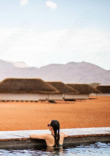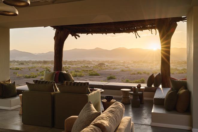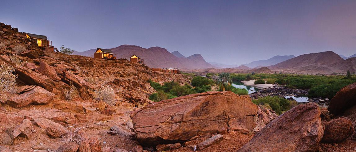 This tiny oasis of luxury is nestled in the heart of the deserted Kaokoland, ensuring a rare tranquil experience. The magnificent lodge sits atop the banks of the Hoarusib riverbed. The dramatic earthcoloured architecture suits the rugged landscape, with a striking dome styled after a signature Himba home.