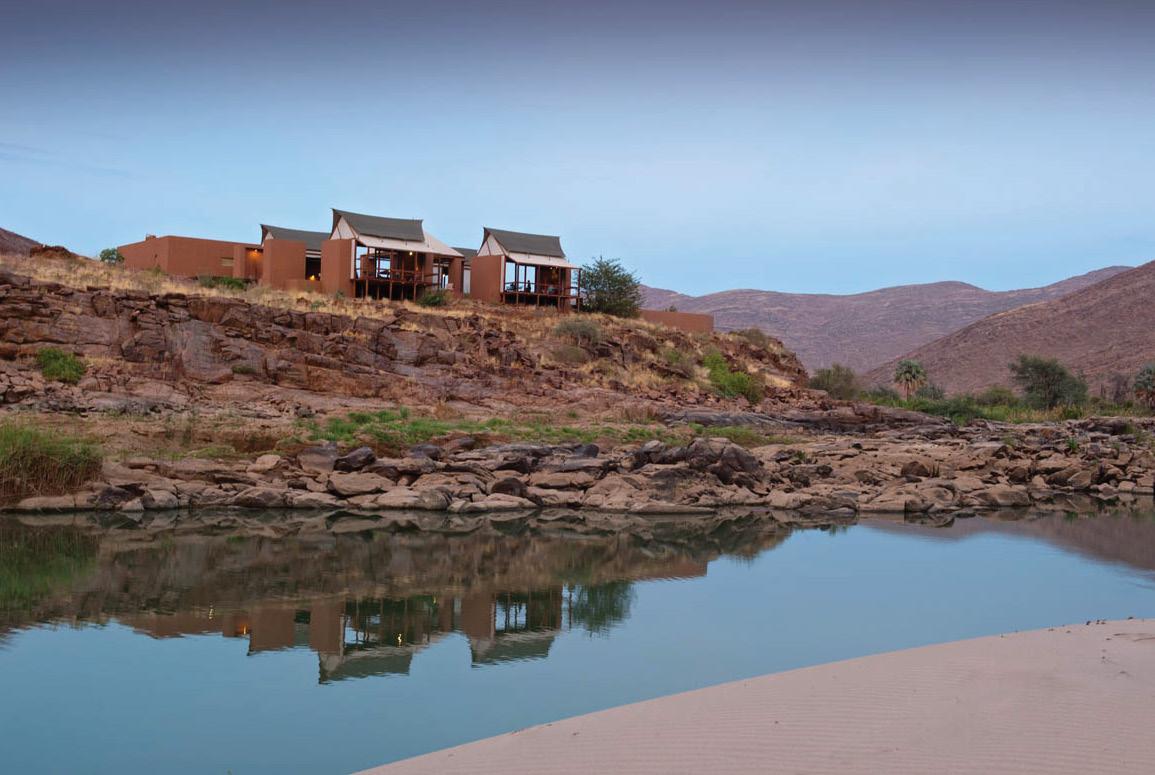 The luxurious tented camp lies on a ridge above the Kunene River in northwest Namibia. If you fly in, you’ll get an amazing perspective on the breathtaking Marienfluss Valley, surrounded by the Baynes, Otjihipa and Hartmann mountains.