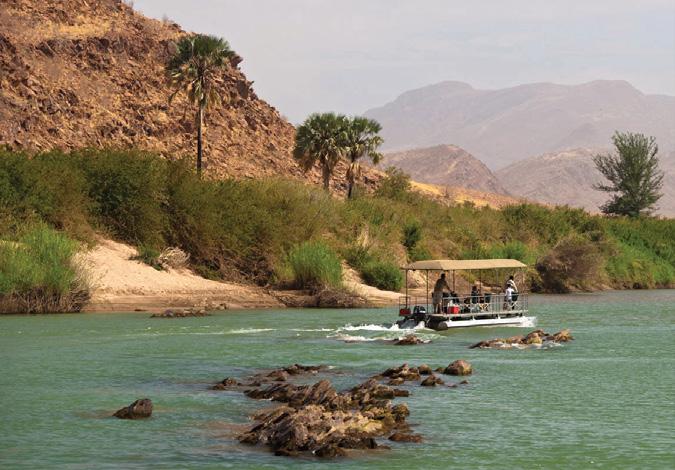 Encounter the amazing ecosphere of the camp from every perspective. A river cruise gives you a croc’seye view of the scenery as you cruise along the Kunene in a small pontoon boat, spying the resident wildlife and native birds. The river forms part of the border with Angola, and you may be able to stop for a peaceful sundowner on the Angolan side of the riverbank.