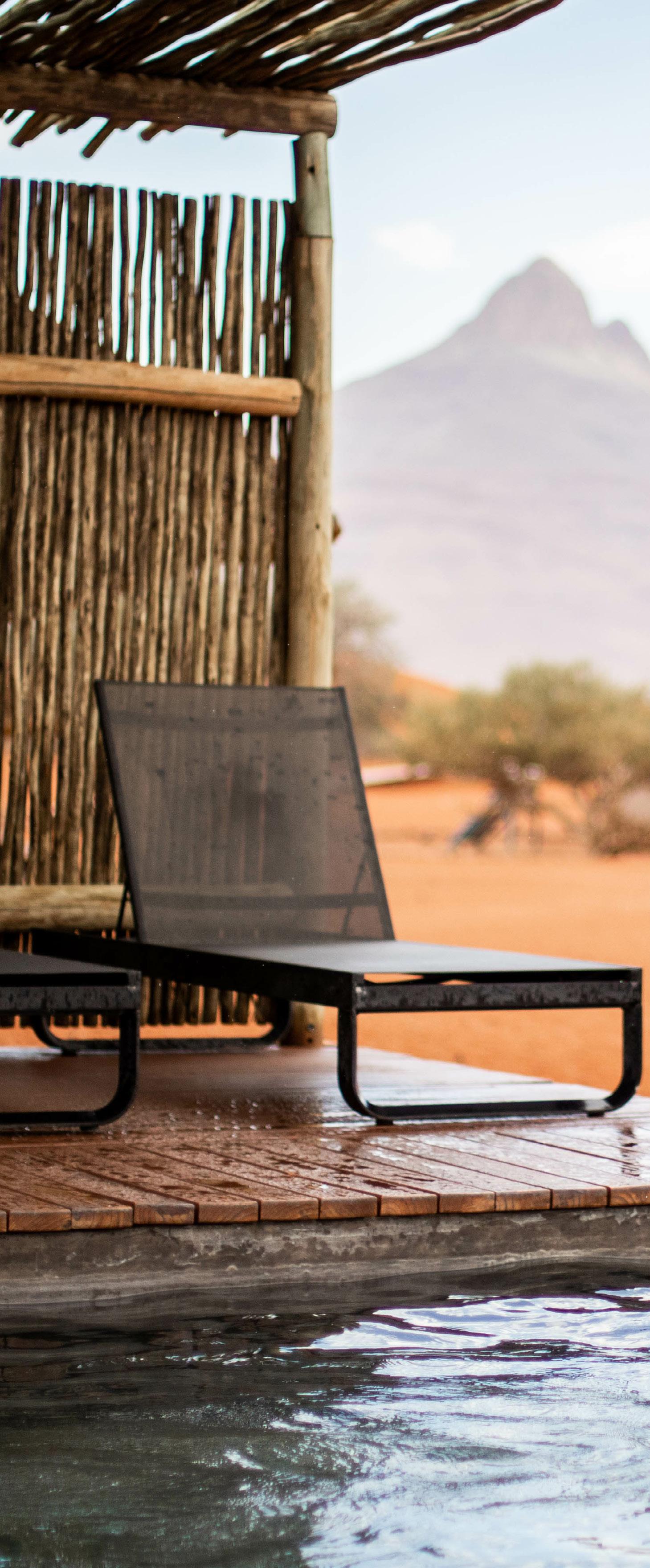 Each suite has a private veranda overlooking the desert. From the shaded daybed, spot giraffe strolling along the river valley or watch the moon rise. The en-suite bathroom includes a bath with a view, indoor shower and a spectacular openair shower. There's also a private family suite with two bedrooms, two stunning bathrooms, a private terrace and an open lounge. The Hoarusib River winds