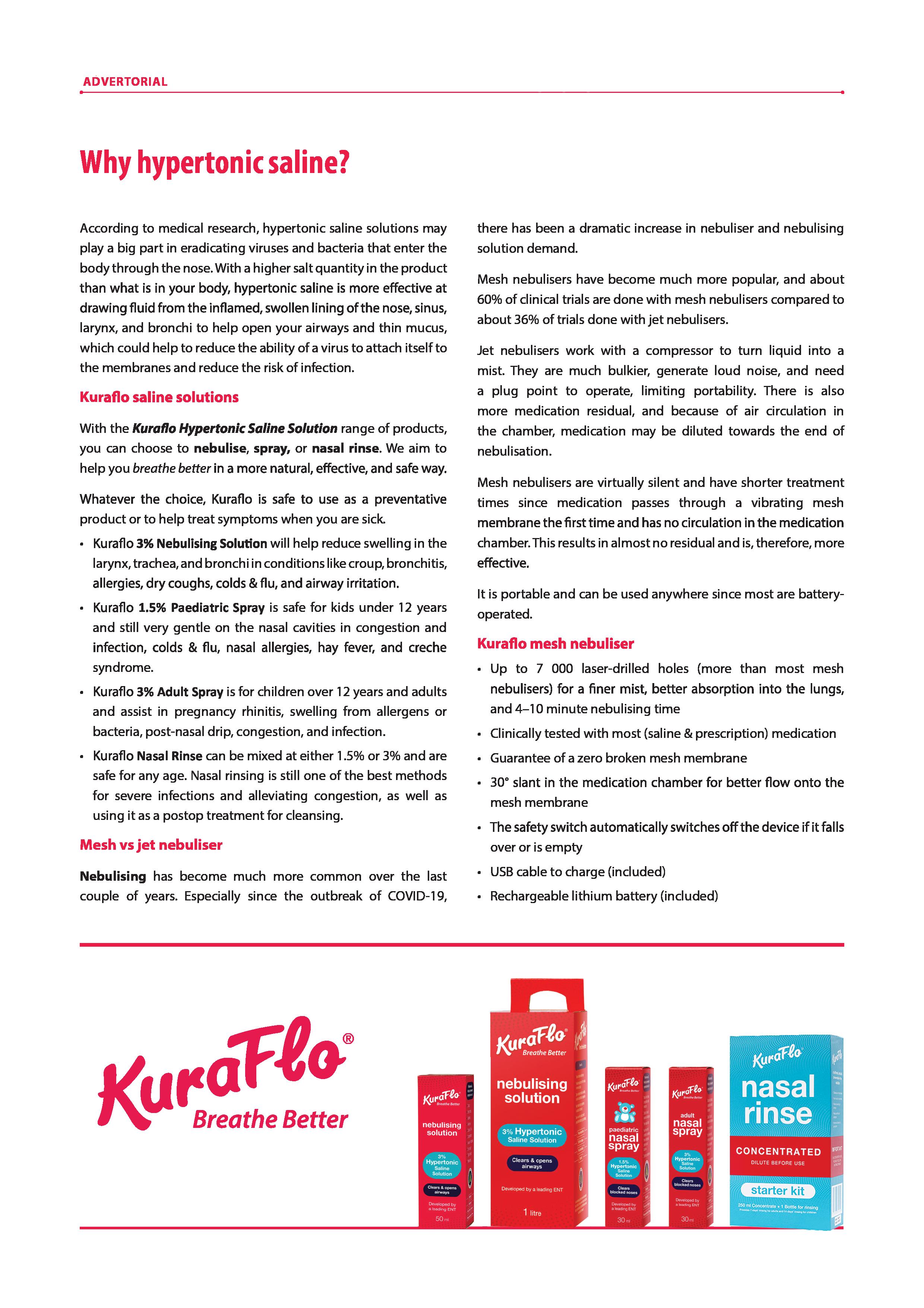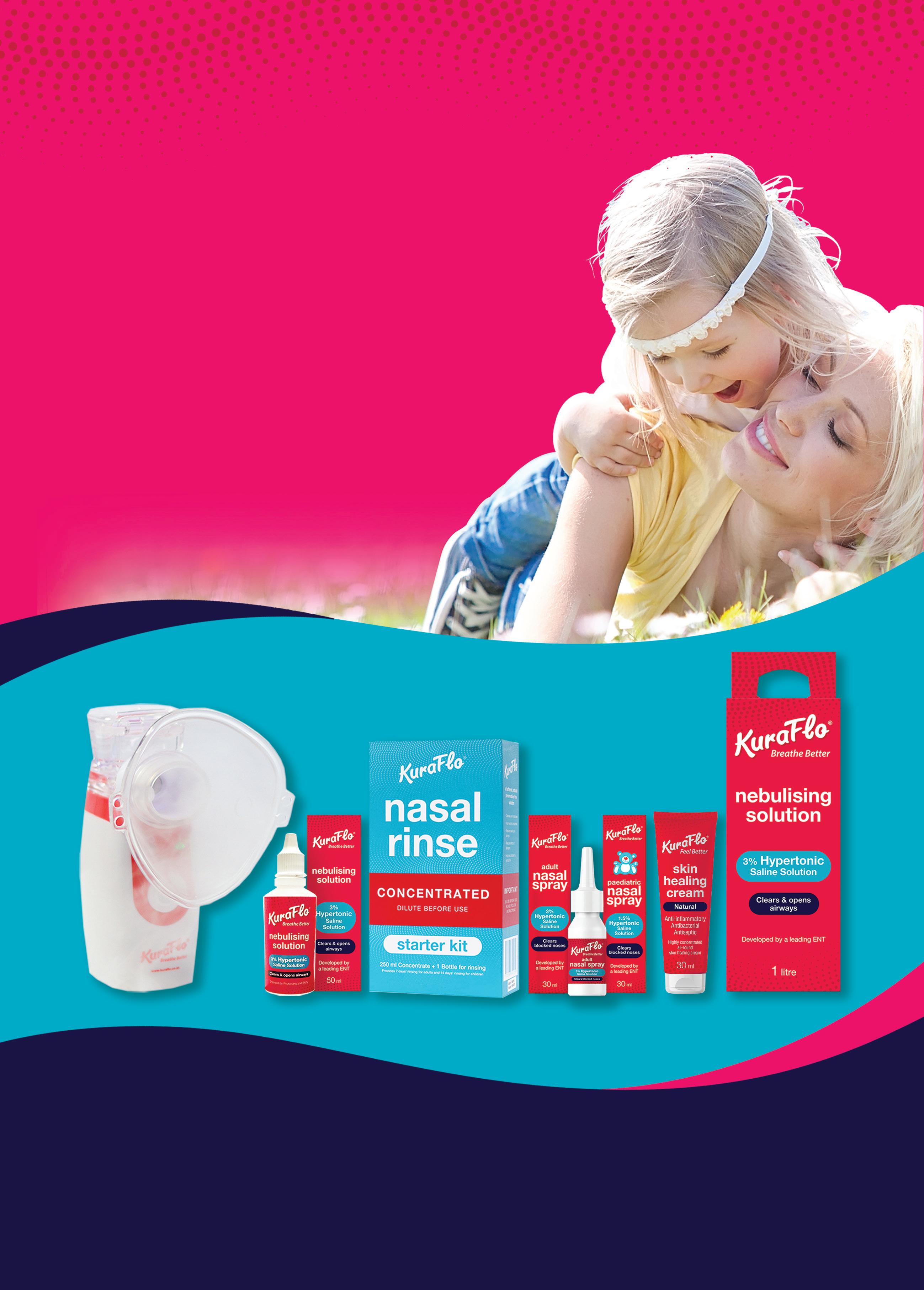 With a higher salt quantity in the product than that of the body, hypertonic saline draws fluid from the inflamed, swollen lining of the nose, sinuses, larynx and bronchi to help open the airways. This then helps wash out those trapped particles.
