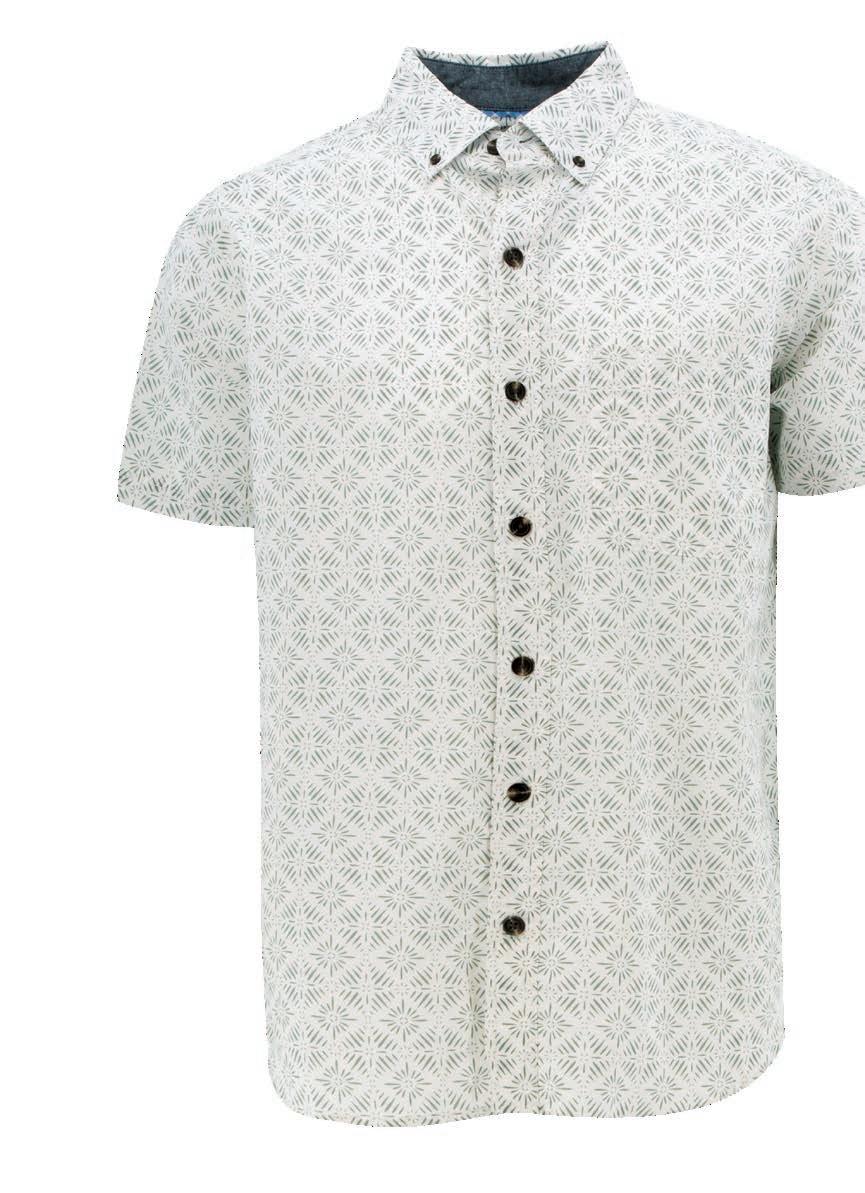 This uniquely sophisticated top is inspired by the origins of the island. The print is derived from primitive island cave markings, giving this a distinctly Hawaiian vibe. A Classic features include a spread collar, button-thru front pocket, double pleat at the back, and Weekender-inscribed buttons.