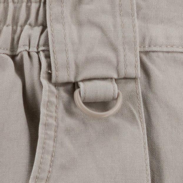 100% rugged cotton Camp Cloth in an 8” cargo style short. Features comfort side elastic waistband with handy D-ring, and pockets galore: deep expandable front pockets, front cargo flap pockets, beverage can/ phone pocket, hidden security pocket and secure zip back pocket.