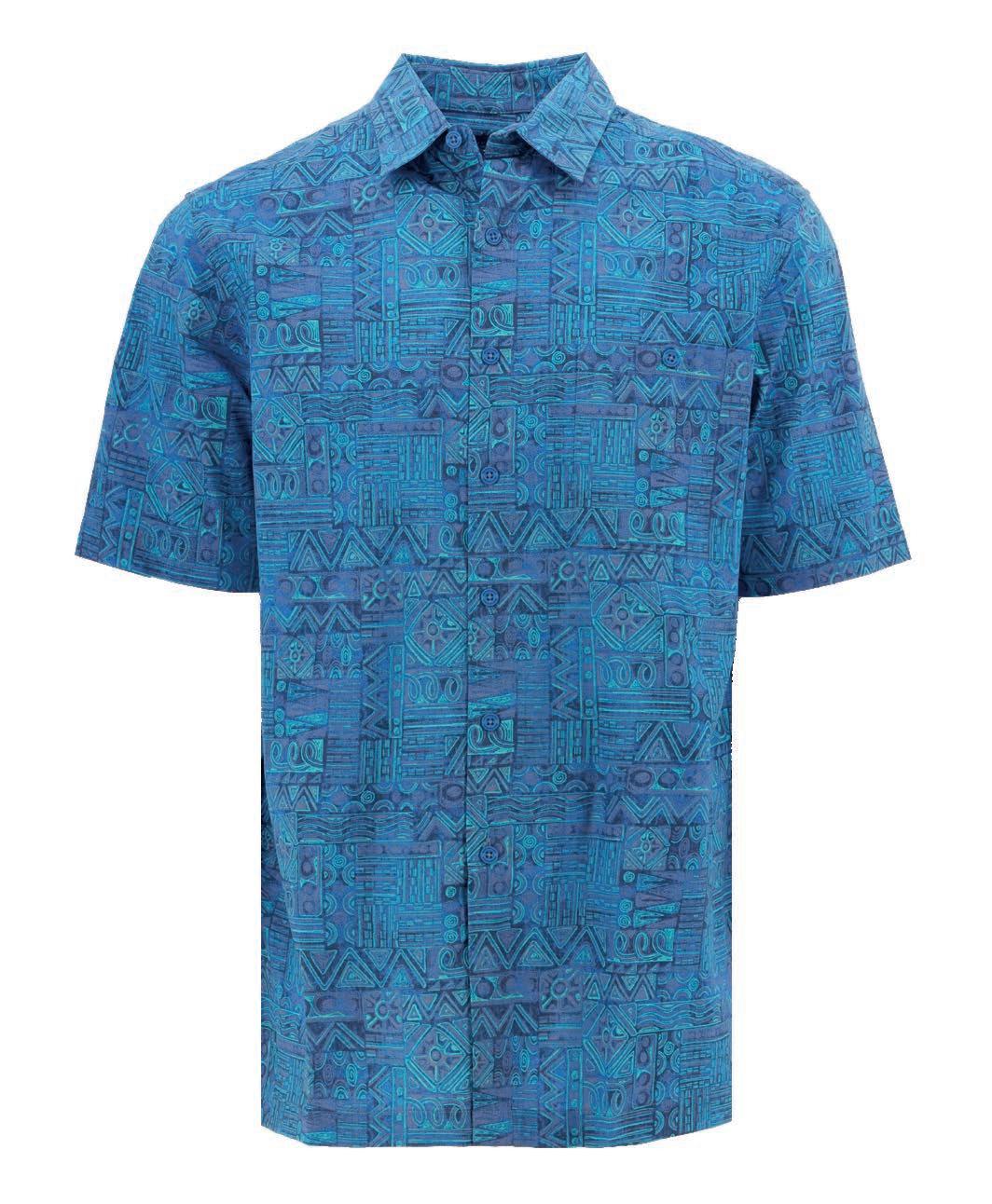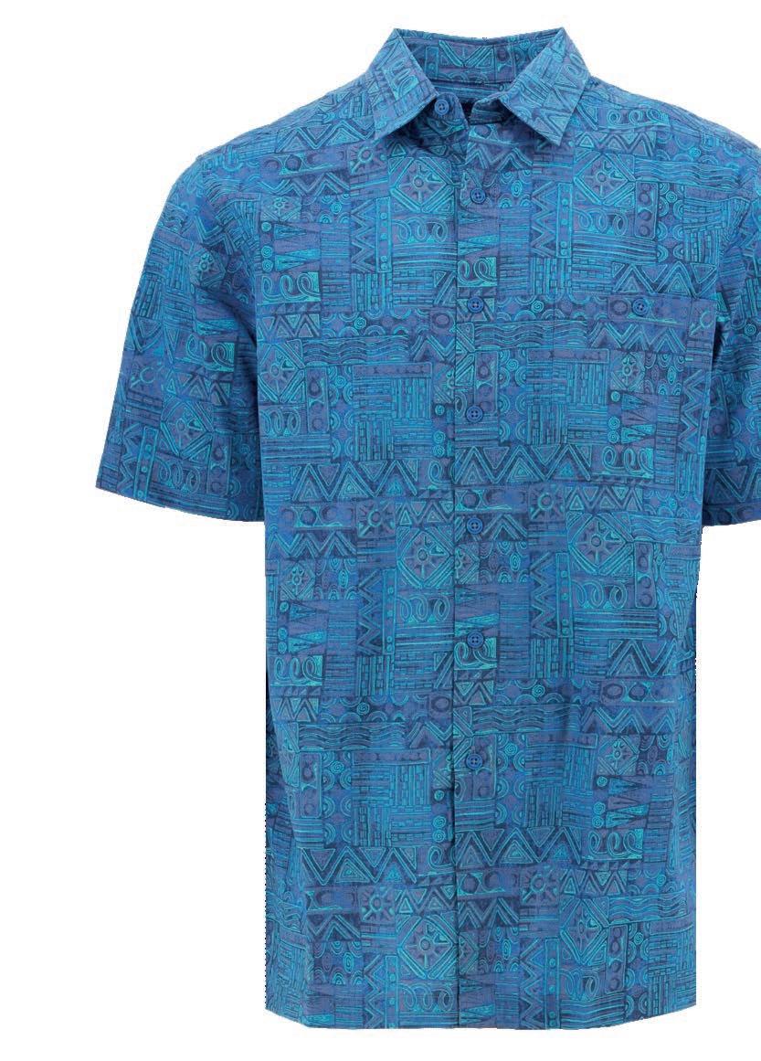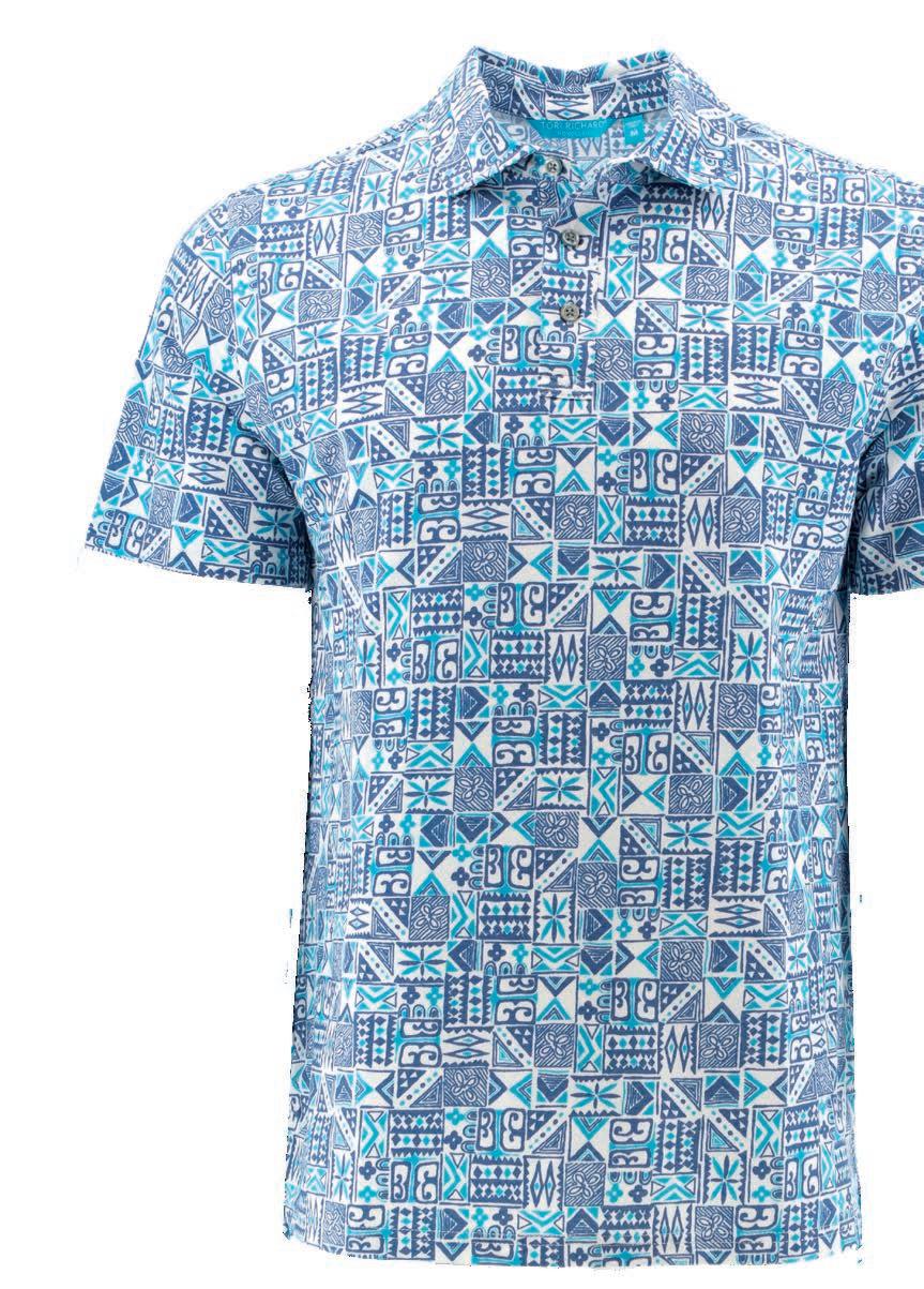 Set into a Marine Blue background, like the waters you dream about each day, this design celebrates classic Hawaiian Tapa cloth, a Pacific Islands practice that dates over 2,000 years. Crafted with Tradewind Technology™, this top is moisturewicking, anti-microbial, quick-drying, resistant to wrinkles, and features enhanced stretch and UPF sun protection. Featuring a 3-button placket, and a straight hem.
