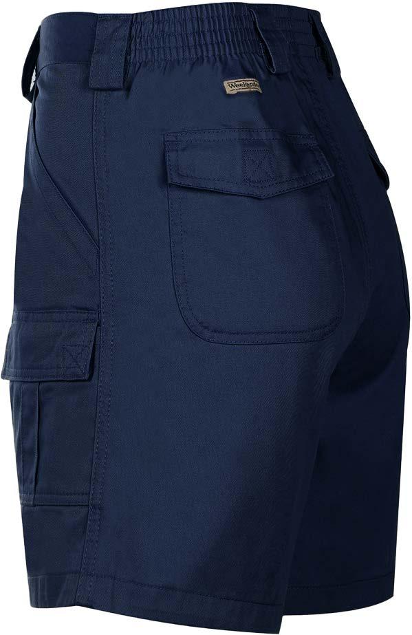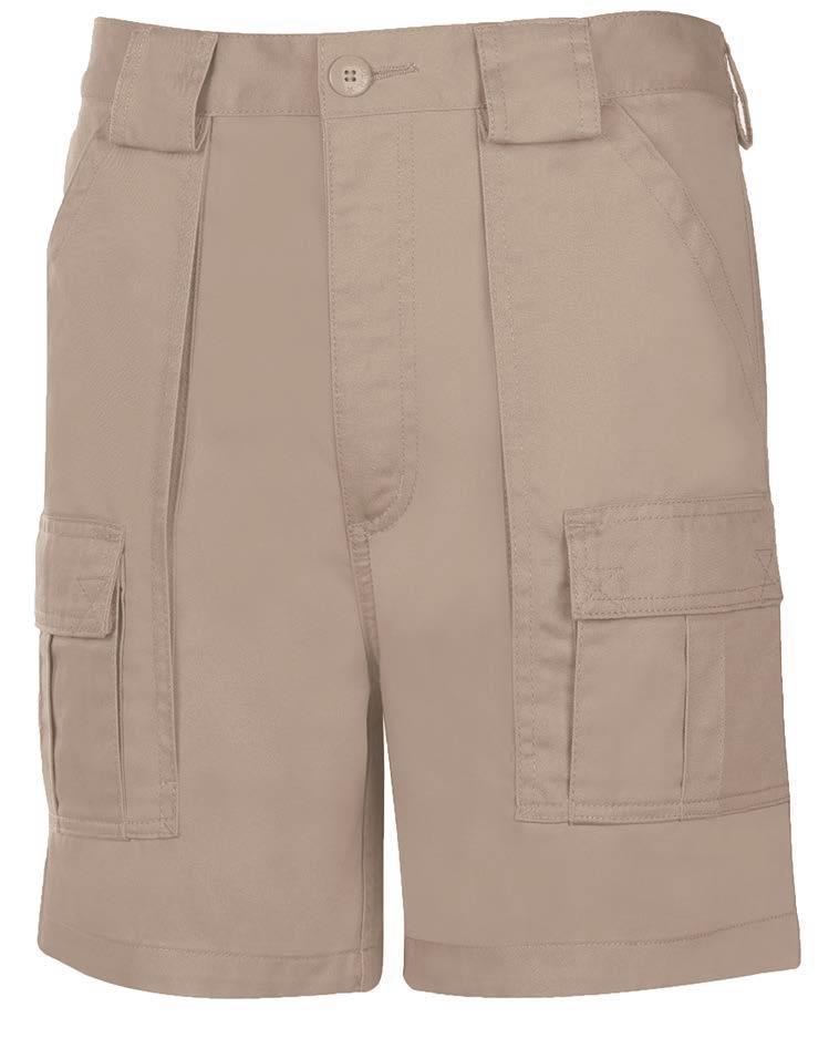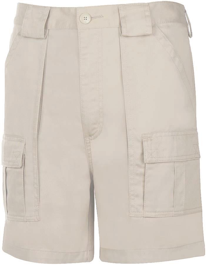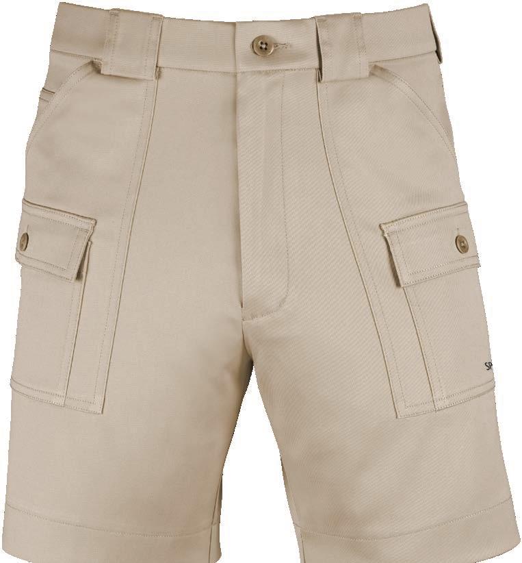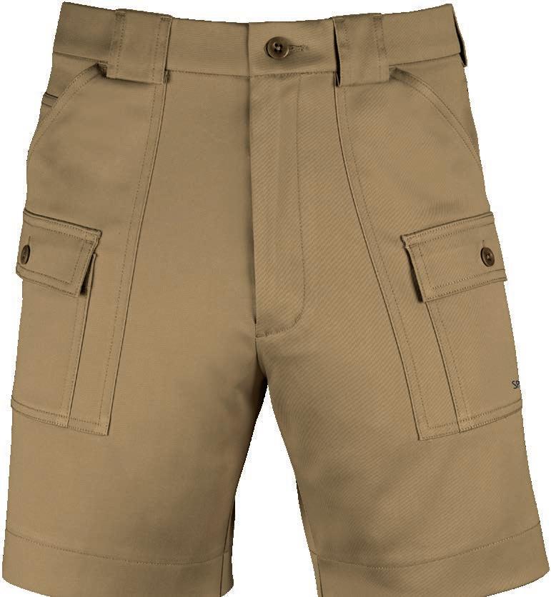 100% rugged cotton Camp Cloth in an 8” cargo style short. Features comfort side elastic waistband with handy D-ring, and pockets galore: deep expandable front pockets, front cargo flap pockets, beverage can/phone pocket, hidden security pocket and secure zip back pocket.