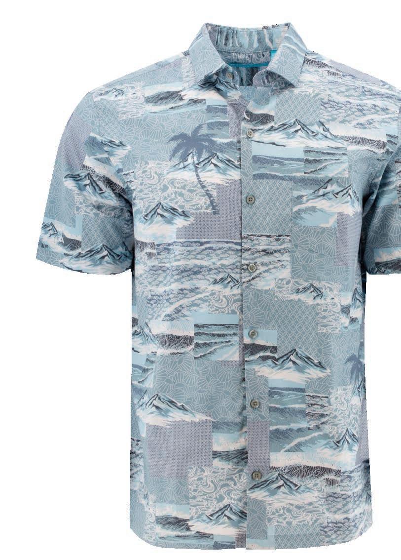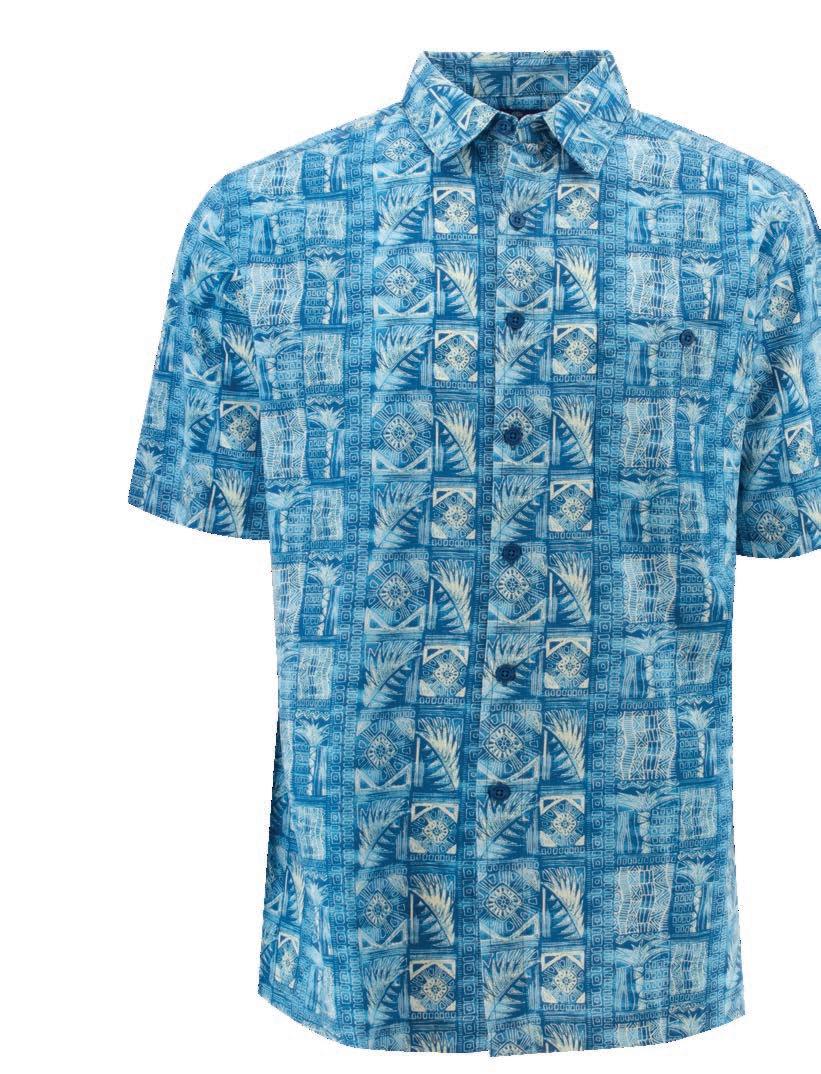 The Sashiko Waves shirt by Tori Richard is a timeless style that is as fluid as the surf yet as relaxed as your spirit. The best quality of this shirt is the lawn fabric made from natural cotton. Cotton lawn has a higher thread count than an average fabric, giving this shirt a silky feel and smooth, drapey finish. It gives this shirt a more laid back vibe. The print is a quilt of volcanoes, waves, and patterns across hues of blue –– perfect island style.