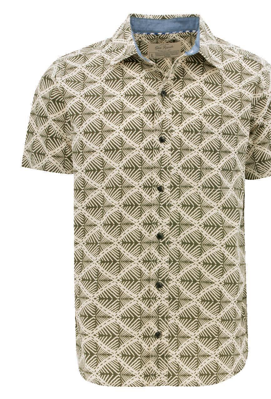 Simply and classically decorated with a single chest pocket, box pleat on the back, and a spread collar. Organic cotton and polyester create a plain weave fabric that is crisp, cool, and structured. The all-over geometric print is easy and sophisticated. Effortlessly styled for casual summer days.