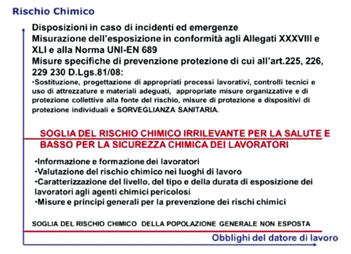Per questo motivo si ritiene ragionevole definire il rischio chimico irrilevante per la salute e il rischio chimico basso per la sicurezza, attraverso due soglie, una relativa alle proprietà pericolose tossicologiche (medio e lungo termine) e una, relativa alle proprietà pericolose chimiche, fisico-chimiche e tossicologiche (breve termine) degli agenti chimici; al di sotto di tali soglie il rischio, che viene generato da esposizioni lavorative anche in presenza di misure di protezione e prevenzione generali di tutela dei lavoratori, è dello stesso ordine di grandezza di quello della popolazione generale, la quale normalmente non impiega adeguate misure di gestione del rischio.