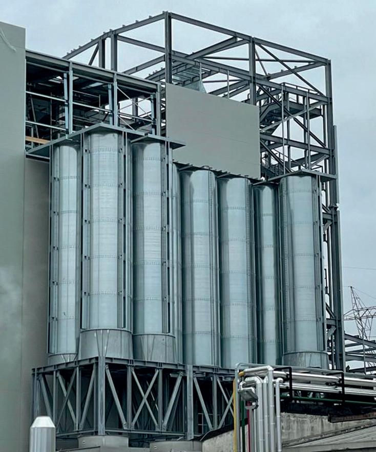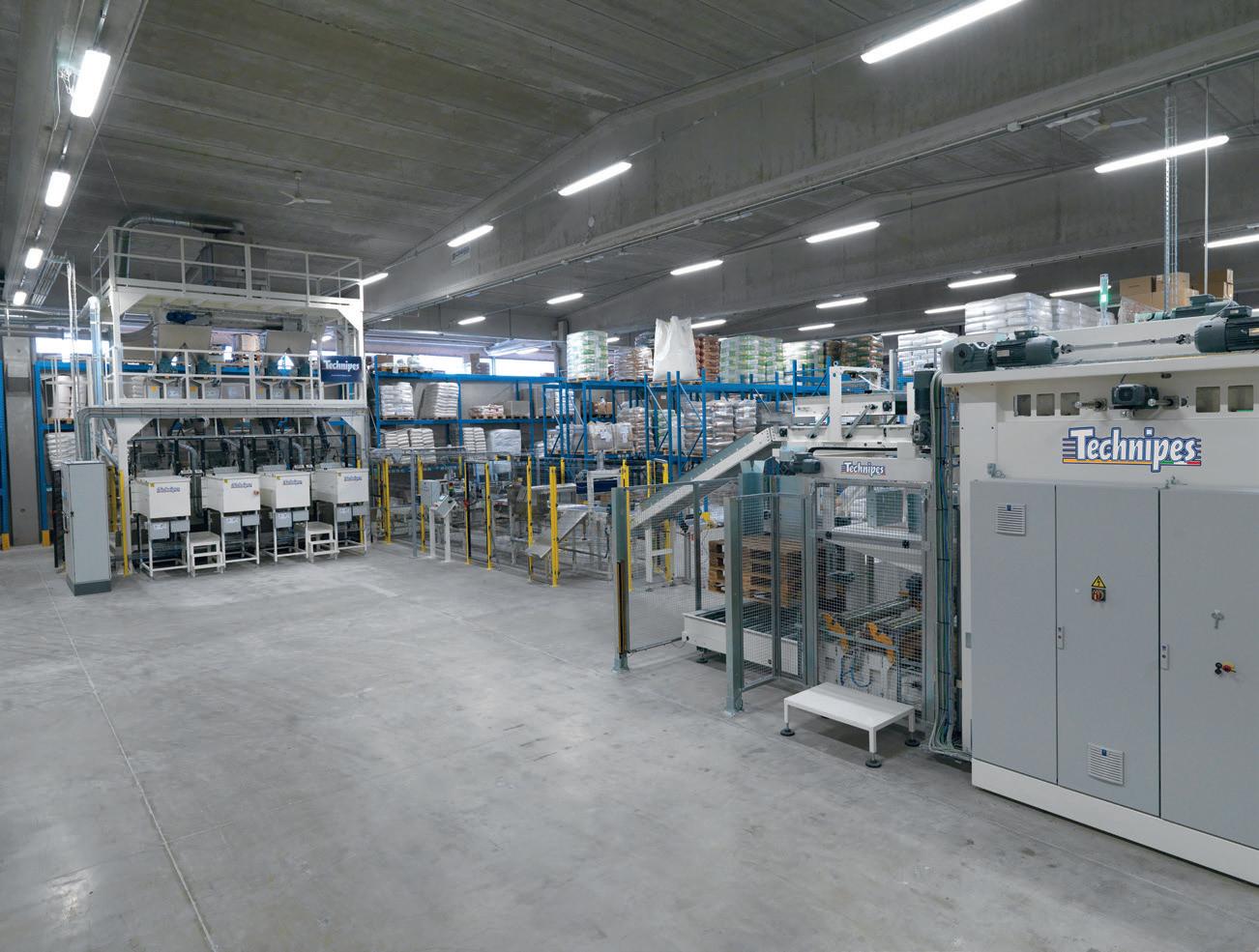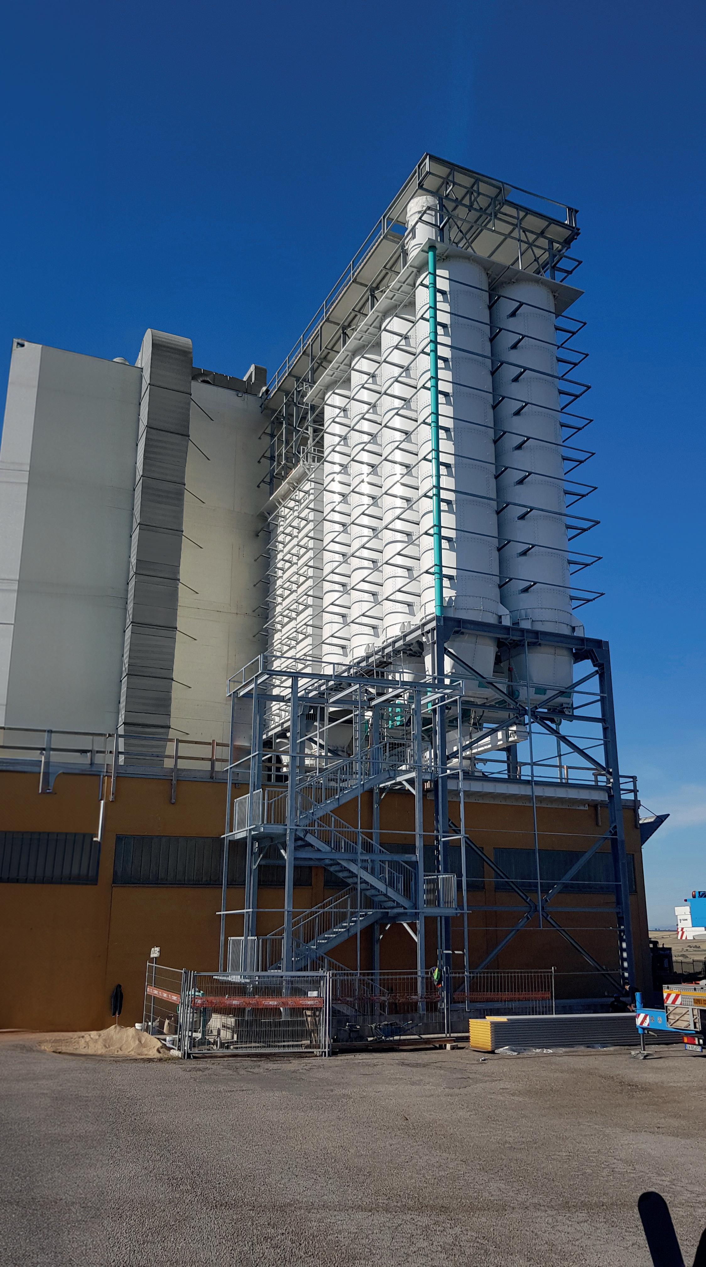 • N° 1 magazzino per alloggiamento confezionatrice e stoccaggio dei sacchi. Il tutto è ricompreso in un unico edificio industriale tamponato e coperto. La sfida iniziale per Technobins è stata quella di rendere esecutivo il progetto ideato da Erregi Engineering, senza dover sacrificare alcune sezioni a discapito di altre e sfruttando al meglio l’esiguo spazio a disposizione (ridottosi a causa di numerosi vincoli in altezza e in area imposti dalle Autorità competenti). A seguito di un corposo lavoro di progettazione, le varie porzioni di impianto non risultano fisicamente slegate, bensì tutte strutturalmente integrate tra loro. La particolare tecnica costruttiva adottata rende possibile la connessione dei profili delle strutture multipiano e dei tralicci di sostegno sili tondi direttamente in alcuni punti adeguatamente