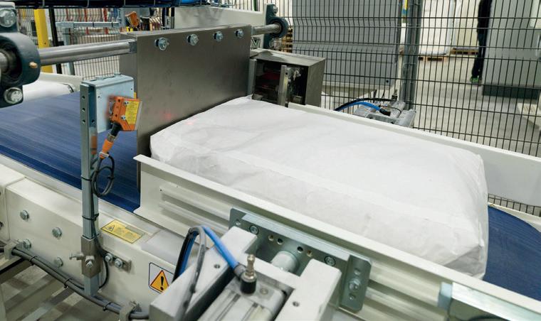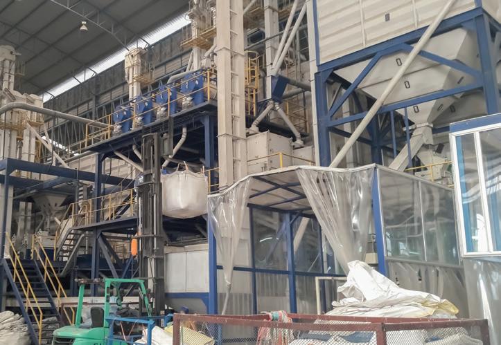 trasporto pneumatico e si ottengono vari prodotti, quali semola rimacinata, semolino, crusca e farinaccio, con possibilità di produzione di farina integrale; • i vari prodotti così ottenuti possono essere insaccati manualmente nella base di insacco, mentre la farina viene stoccata nei silos in tessuto Trevira per essere confezionata manualmente, mediante un sistema di pesatura semi automatico targato Molitecnica Sud, in sacchetti da 1 a 10 kg.