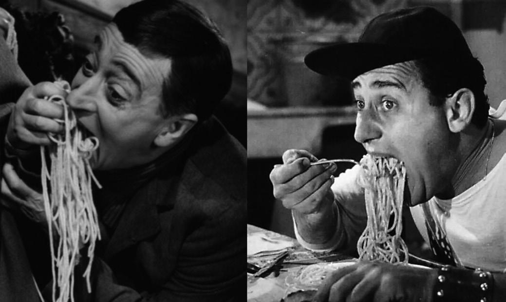 i protagonisti si trovano davanti a un’abbondante fiamminga fumante di spaghetti al pomodoro, su cui tutti - Totò in primis - si fiondano con le mani, alla maniera dei “lazzari” o “lazzaroni” napoletani già dipinti così nel Seicento. Emblema della lotta contro la fame - ben prima che della cosiddetta Dieta mediterranea - gli spaghetti al pomodoro diventano così il simbolo di una delle scene più memorabili del cinema italiano. Senza dimenticare altre ricette tipiche della cucina povera, come la pasta e ceci de “I soliti ignoti” (1958): piatto semplice, sì, ma che riempie la pancia. Poca forma, tanta sostanza. “Fast forward” di trent’anni e si arriva - nel 1986 - alla clinica di dimagrimento di “Sette chili in sette giorni”, dove Pozzetto e Verdone se ne inventano di ogni per tenere i clienti lontani dal cibo (si pensi alla “cena psicologica”). Poi però anche loro devono prepararsi qualcosa da cena, e una notte tocca alle penne all’arrabbiata. Il profumo della pasta, e in particolare dell’aglio, sveglia tutti gli affamati clienti, che si presentano in cucina tra pigiami e vestaglie, e vengono cacciati fuori bru-