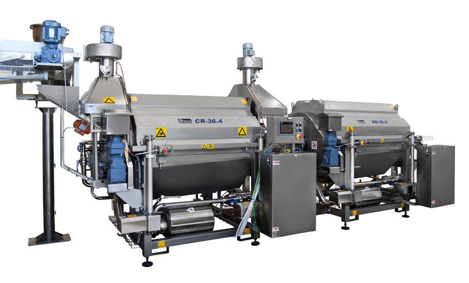 po di cottura o di raffreddamento ottimale. Nessun problema per il sale, viene utilizzato acciaio inox speciale per le parti a contatto con acqua salata (AISI 316). Pulizia a fine lavorazione: il coperchio della macchina in pochi secondi si solleva mediante martinetti elettrici a vite con sistema di autobloccaggio di sicurezza e le reti esterne del tamburo si tolgono agevolmente, per il massimo accesso al lavaggio anche con idropulitrice. Il sistema di controllo temperatura automatico “Steam control system” garantisce il mantenimento della temperatura desiderata.